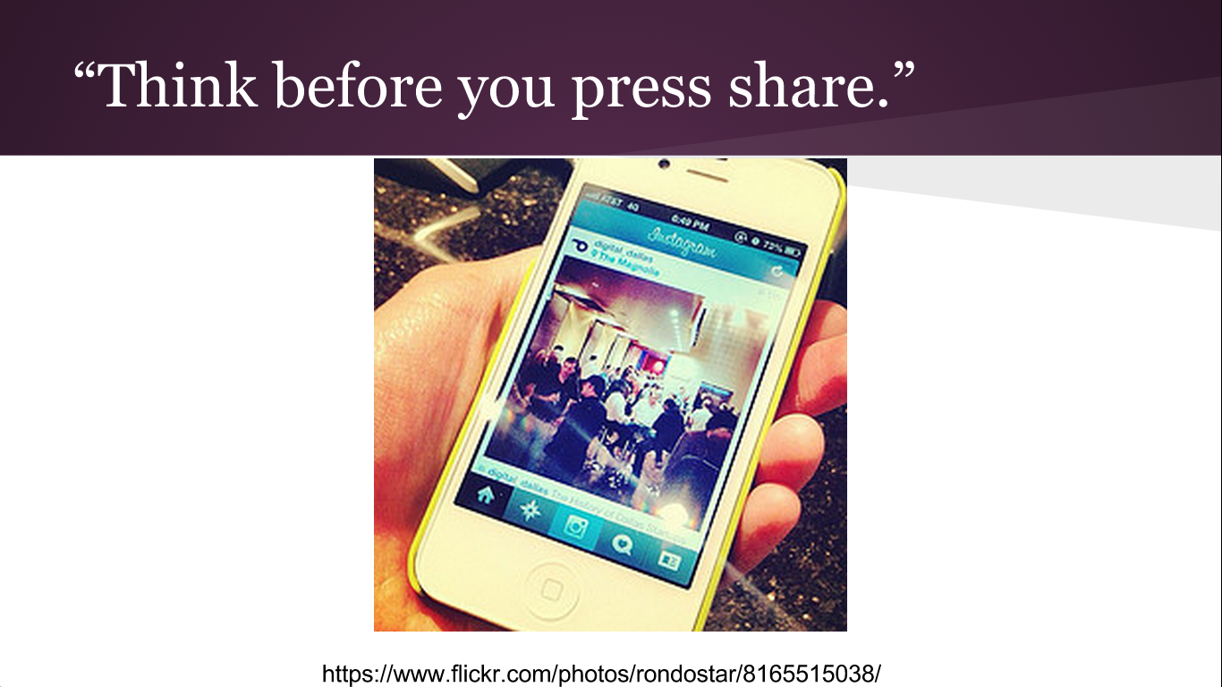 I chose this picture because it shows someone sharing something. Maybe later he will regret sharing what he shared. That's why I said think before you share because if you don't you may regret it in the future. Like Ms. Hertz said in class she thinks why is she posting something before she posts it.