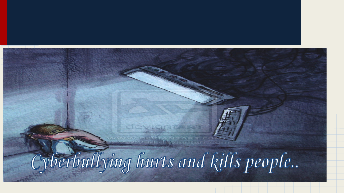 The reason i choose this image is because it shows how the boy is scared and afraid of what those bullies are saying. I can see that he is hurt by the way he is sitting in the corner and as the screen is getting closer to him. He is probably thinking of killing himself. What i am trying to say is people like him feel that way because of the bullies that are out there. My words would be cyberbullying hurts and kills people.