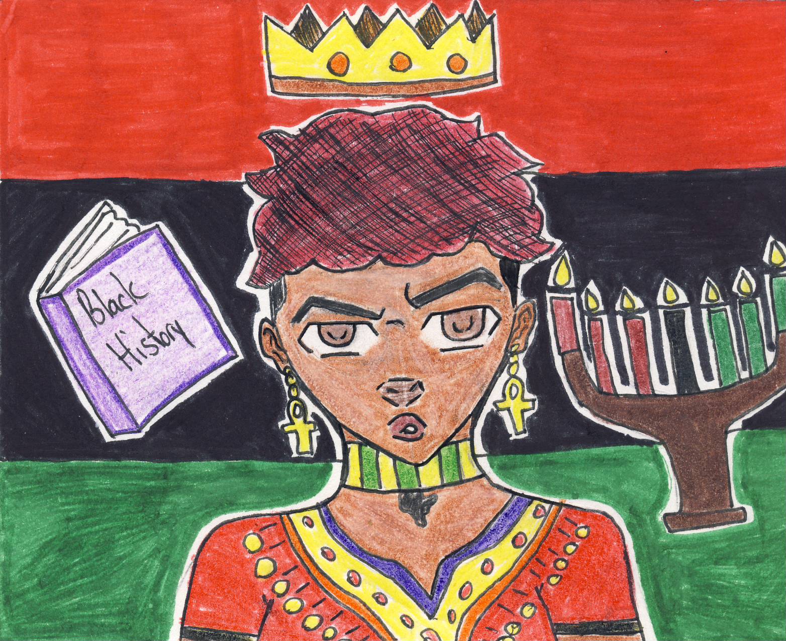 I made a visual representation of myself that is completely immersed in African culture. This would be the reason why I have a book of African history, the kinara ( candleholder ) with the candles, as well as the crown since we derived from kings and queens.I want to communicate that I didn’t forget about my african history or lineage and that’s why i drew some prominent themes.The tools that I used was a pencil to sketch the drawing, a eraser to remove mistakes, micron pens to outline the whole drawing & color pencils and markers to color the rest of my drawing. I don’t think this really relate to any of my previous work because I never did work on that represented the African culture before and that’s the reason why I did this. So when I was creating this, I thought it was unique because I was working on something that I had information on and then I decided to make an alternative version of myself, indulging in African culture and holidays because I actually appreciated and respected them. That’s when everything went well for me because everything flowed from me sketching the drawing to coloring it,so my process was really simple and easy.