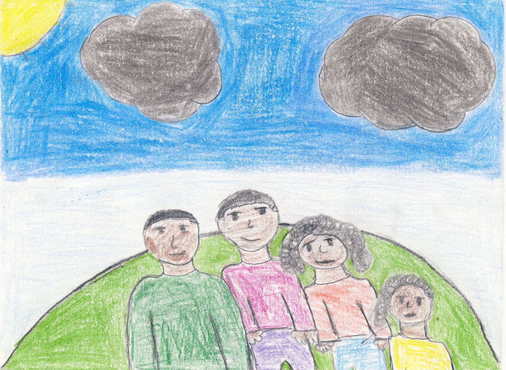 So, my portrait represents my family as a whole when it was the best time and together. So, on my picture I made my mom, dad, and sister this was to show how good of a family we were but, still had some problems. So, I made it seem like we were a nice and peaceful family like the old days and had it so we were in a park having fun because that is what my sister always wanted to do. In this art work I wanted it to represent my family and how good it was and how the sun was shining and also the bad times by have two colored skies and gray clouds. For this art work I used a lot of materials well just color pencils and then when I used a blue color pencil to make different shades and also I used gray and mad different shades I used each color pencil in a detailed way and also pencil which I used to outline. This only related to my work by how it symbols my living situation but, the other I used different materials and had fun. Vincent Van Gogh makes self portraits and has done crazy things for the people he loved so that’s why I did. I learned a new technique in art called shading along with my outline and it was the best thing to use in this artwork. I am most proud of my use of color and different shades because I think it was well done and fits great in my portrait. If I could change one thing I would change the clouds because maybe I should have kept them white to resemble more happiness in the portrait.