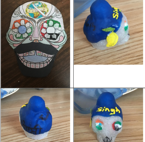 The sugar skull was nerve-racking to make, because I felt like it was going to remind me of the way my grandfather looked. My grandfather followed Sikhism, he wore his turban which is one of the five required Khalsa’s to be followed. The turban was also his pride, he felt like a Sikh while wearing it. The turban was an integral part of his identity as a Sikh in Dubai and Abu Dhabi, and so the skull has a parka placed on the head. A patka is the informal way of wearing a turban. The word “punjabi” is written in Punjabi because he had a lot of wise thoughts in Punjabi phrases. The word “family” is also written because he used to treasure his family and really did everything for us. The word “Singh” is written because each Sikh male last name, Singh adds greatly to their identity as Singh means lion. A necklace like object is placed around his “neck” with a Khanda. The Khanda is representing the religion he follows which is Sikhism. Again, as mentioned for the masks I painted India’s flag in the right eye, while United Arab Emirates flag is placed on the left. There are mini mango because mangoes was his favorite fruit. Twice a week he would bring either a case of mangoes as they were eaten in abundance by him and others. His face is covering in silver/white glitter as he was our shining star. If we were down he could always cheer or motivate us, he used to shine for us when we needed his shine the most.