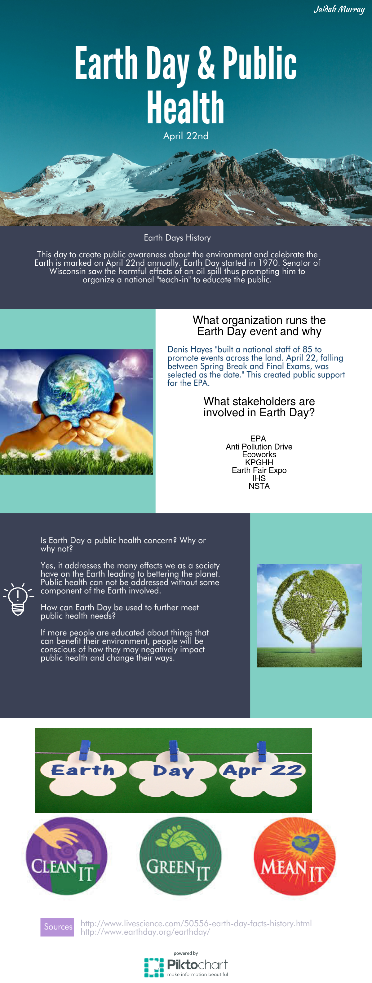 Earth Day & Public Health Posted by Jaidah Murray in Anatomy and Physiology · Aziz · E on Saturday, April 22, 2017 at 7:43 pm new-piktochart_21899253_d7de1e15730dcb56232e91b0ec53692d2a0a9a7d Comments No comments have been posted yet. Log in to post a comment.