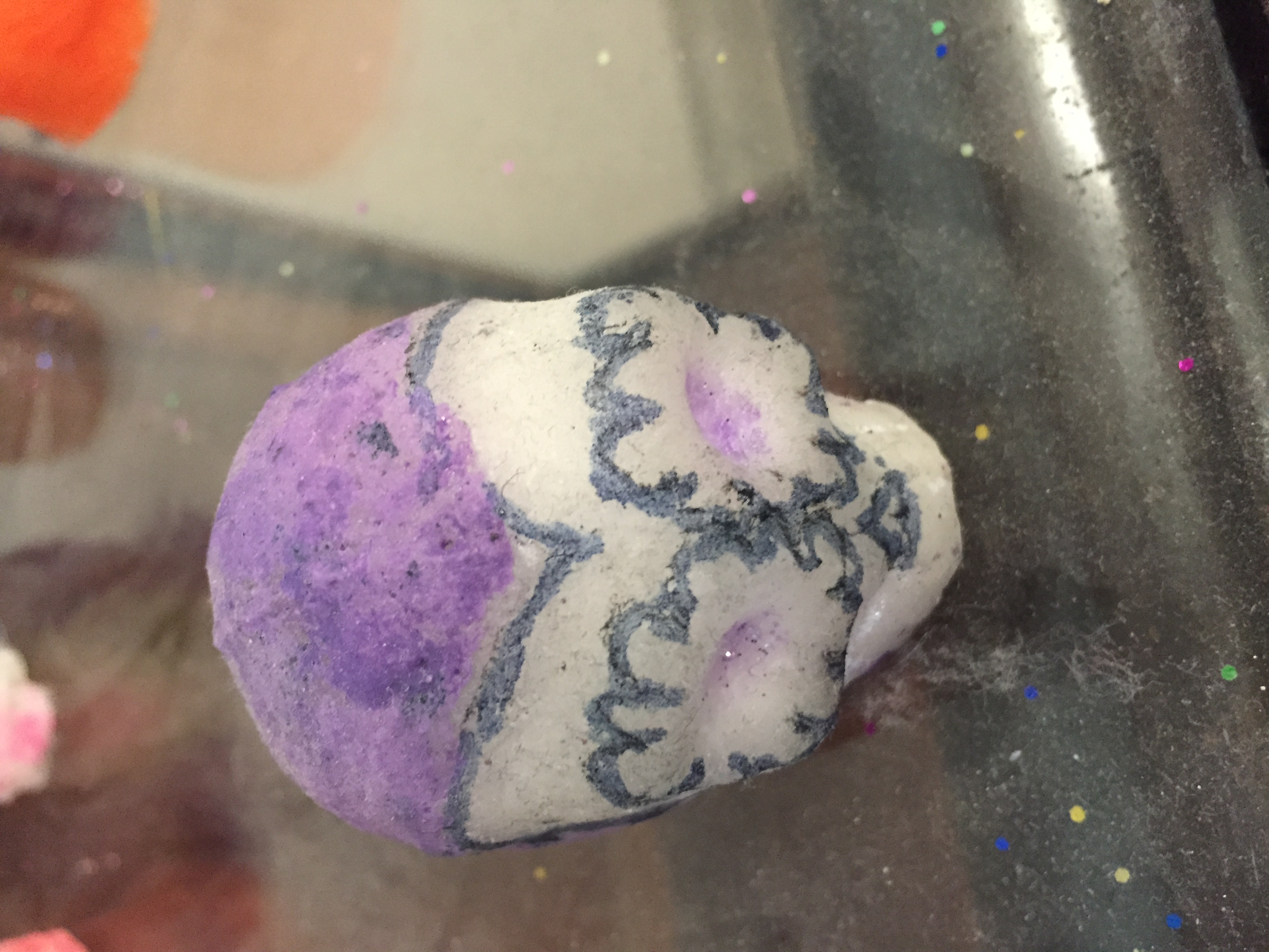 d. My sugar skull reflects my cousin because i designed it with features of things she liked. If you look at my skull you would notice that there is kind of a flower design around the eye socket. I did that because she loved playing with flowers and i also colored it purple with some blue lining because those were her favorite colors. .What better way to represent my lost loved one with one of the things she liked the most.