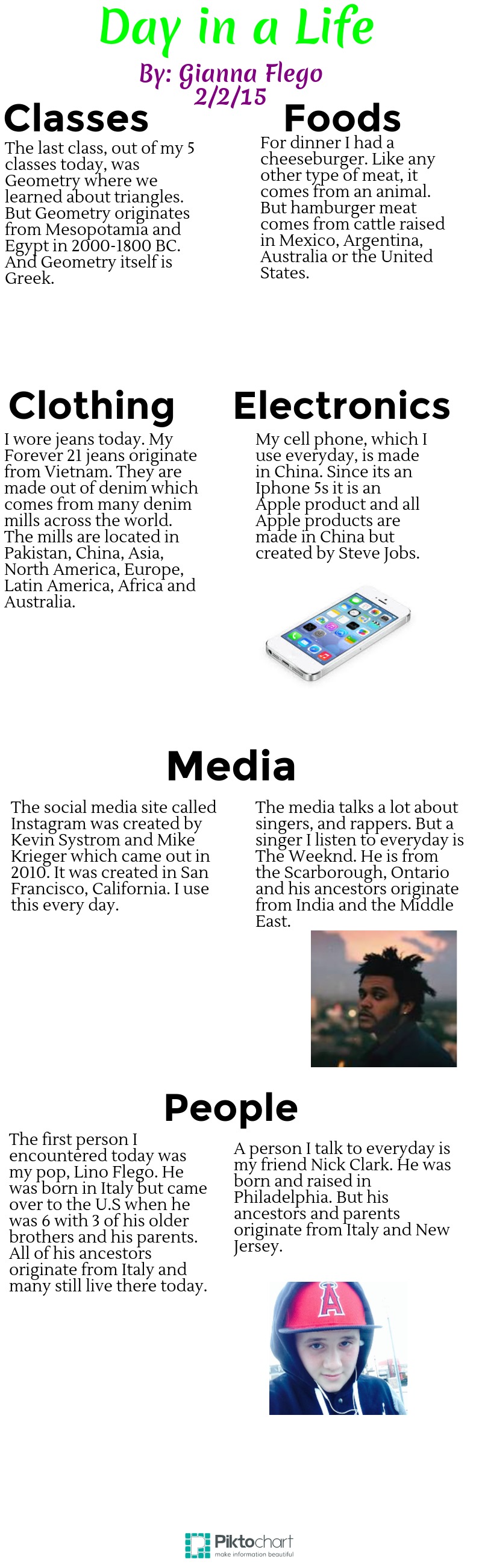 Gianna's Infographic Posted by Gianna Flego in WORLD HISTORY - Roy - B on Monday, February 9, 2015 at 6:47 pm Day in a Life (2) Comments No comments have been posted yet. Log in to post a comment.