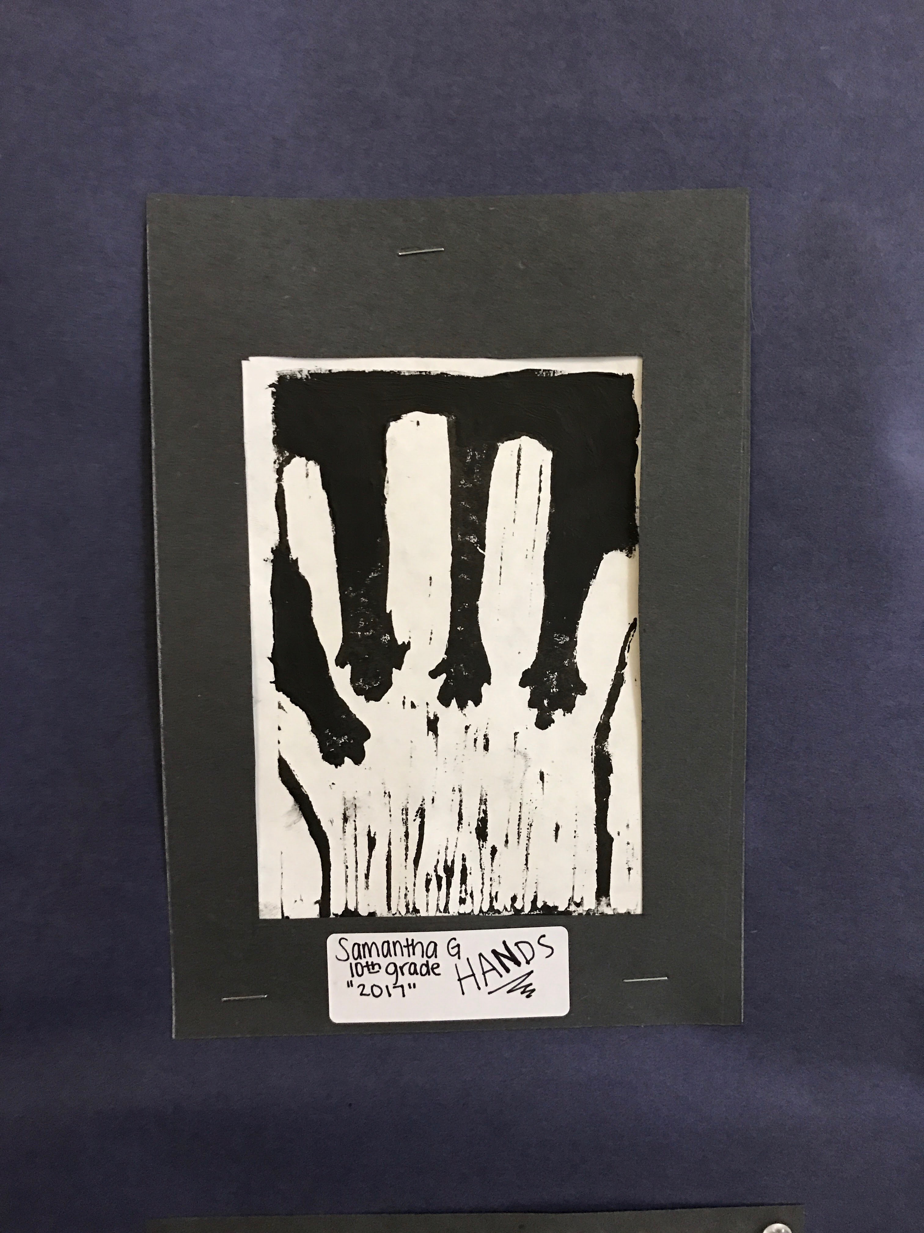 The way I created my work was firstly I sketched a draft of what I wanted my drawing to be like in my art book , and once I was done that I took a piece of copying paper and placed that over top of the linoleum cut to copy my sketch the exact way I wanted it. After this process it was pretty light on the linoleum cut so I took a sharpie, traced it I grabbed the cutting tools i heated up the linoleum cut with the iron and started carving but it was a specific one I used first to trace out the whole hand to make it easier and I started carving out my drawing but I had to look at which one I wanted to be the positive and negative and space. Once I finished carving I took some ink and two rollers one for ink directly on the linoleum cut and the other was a dry one used to press on the paper to make the print come out. This was the whole process of the linoleum cut. I had no inspiration on my image I came up with this on my own because everything I looked up online was hard so I thought it be cool to come up with my own thing to draw. This artwork reflects on the world I live in because hands are how you get through your everyday life. This reflects on my own life because without my hands I wouldn’t be able to do anything I love or even type on this computer right now lol. My art work actually can put an impact on the world because it would make people stop taking their hands for granted in certain situations. One technique that i s very important to this work is the carving skill because if you don't carve correctly or miss one important little piece this will show on you art work and it will become annoying because if you want it perfect you will have to keep repeating this cycle. A new technique I learned through this process is carving , if the linoleum cut is not warm you can even carve it and I never used these cutting tools before. Overall this project was challenging not as easy as it seemed!
