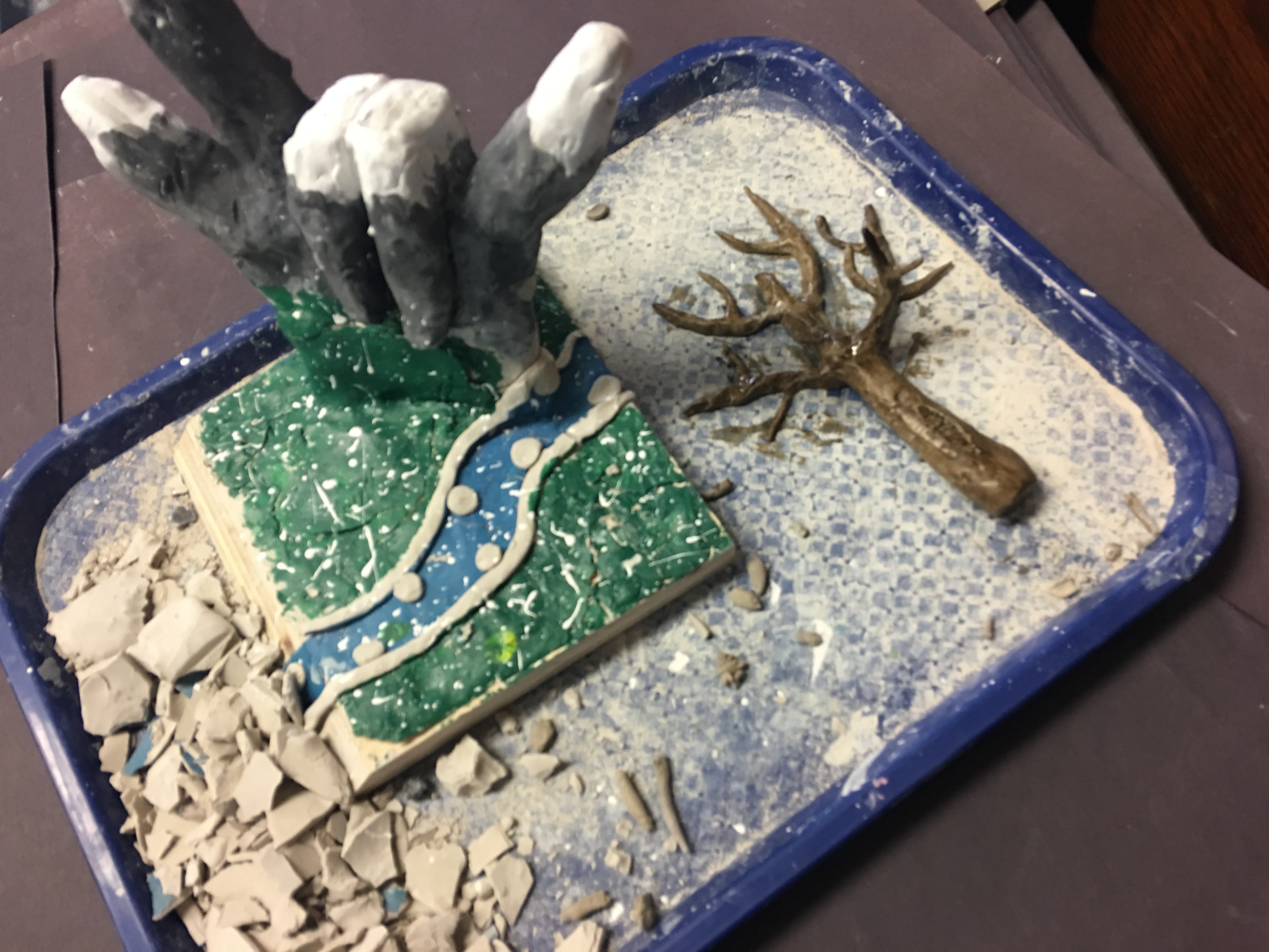 For my piece, First I Had to make the decision of using clay. At a few failed attempts i initially used a glove, then used news paper and glue to form a mold around my hand, then let it dry. Since i got impatient i didn’t let it dry fully and used tape to do the mold but forgot that i needed to take my hand out of the mold. So i cut a slit down the middle took my hand out and was left with this deformed hand mold. I compromised and just used clay to give it its current form. It took a lot of clay and water to make it hard and think like a real hand. After that was done, I got a plank and hammered two nails into it to hold the hand up in place and then took clay and covered the nails so it was like they were never there. After that i covered the plank in clay and painted it making a river, it continuously cracked but i kept going over it until it got tired of me and decided not to crack anymore. I Painted all of it and decided i needed a tree which i alo made out of clay and painted. There was no inspiration for this piece i improvised the whole thing because i wanted it to truly be original which is probably why i ran into so many mistakes.