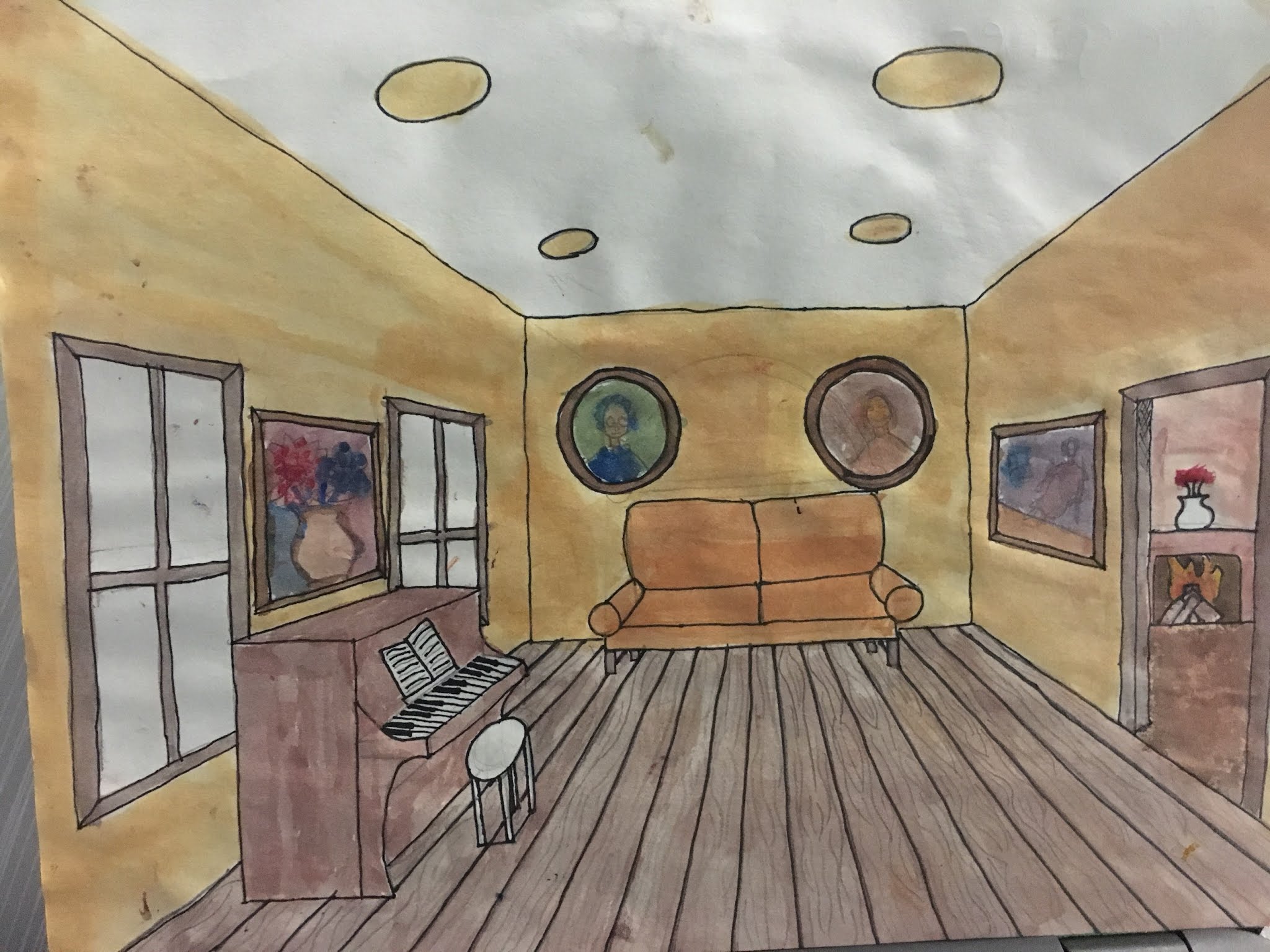 the room that i drew is a parlor that contains a couch and a piano. it has a number of paintings and a couple windows. ive learned that one point perpsective also applies to circular objects. im most proud of the piano i drew, because it looks really good and consistently applies one point perspective. i wish i could have gone over it with the sharpie pen better and gone over it with straighter lines. i also wish i could have done the paintings better and in more detail. for someone doing the project next year i would tell them to use a ruler and make sure that everything goes towards the vantage point.