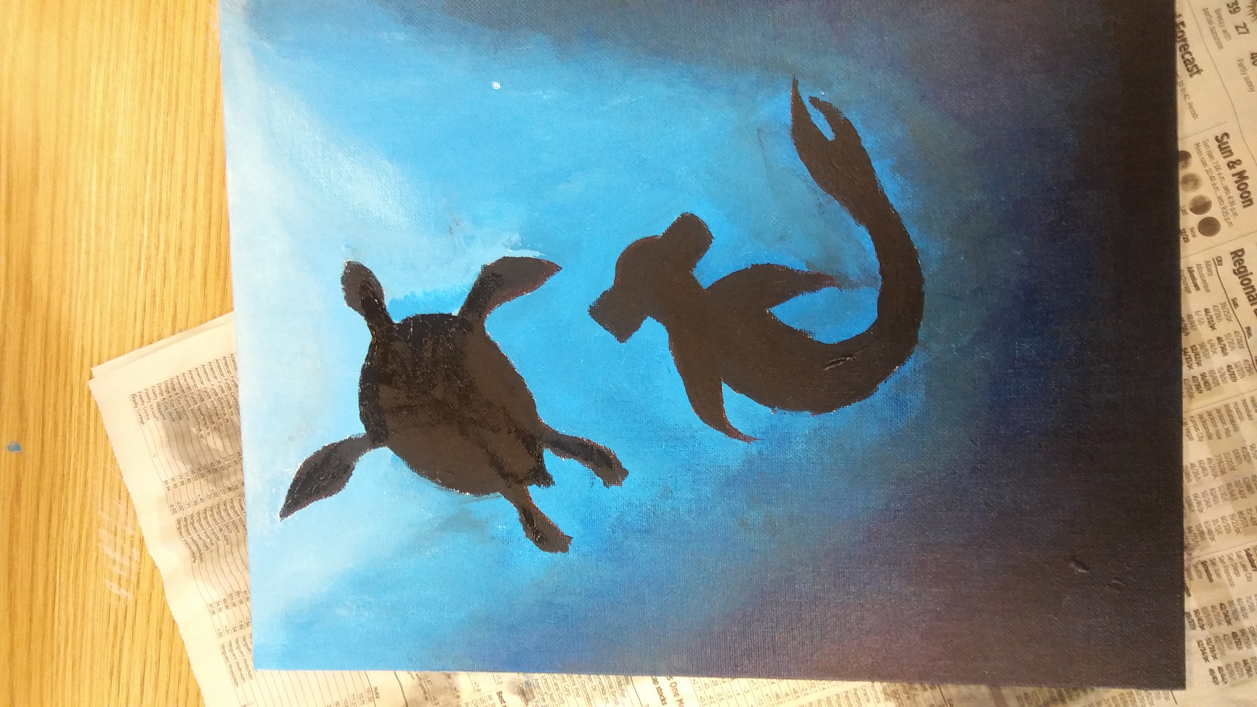 I choose the Limited pallet project, for the project I painted a hammerhead and sea turtle. I choose those them because they one more of the most elegant sea creatures in my eyes. They’re also one of the most understood animals. I wanted people to be able to see the beauty of the animals and ocean. I wanted them to get a nice warm feeling as if they were swimming under them. This is something that i try to incorporate into all my drawings. I always try to make the person feel something apart of the art. I like for my drawings to tell a story.