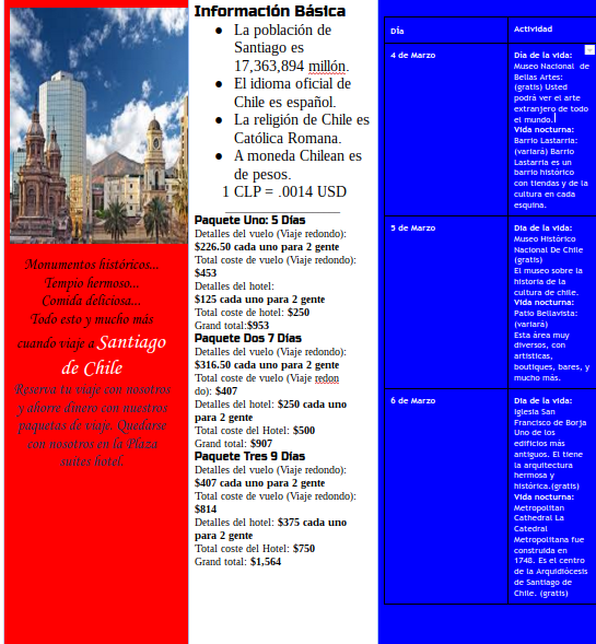 For the Quarter 3 Travel Project, we had a lot to do but it was very exciting. We had to basically become apart of a travel agency and plan a trip for 2 to a Spanish speaking country and map out their whole trip. To show what the couple was going to do and how they were going to get to the place of their choice we had to make a brochure, slide show and commercial. The brochure was to show where they were going, how much everything caused and their daily activities.The slideshow had to also include the same information but more into detail. Lastly, the commercial was to persuade people to book with our travel agency. This benchmark, was a struggle especially becuase it had so many components. I overall enjoyed the project because it was so much fun planning the trip and finding information about a new/foreign place.