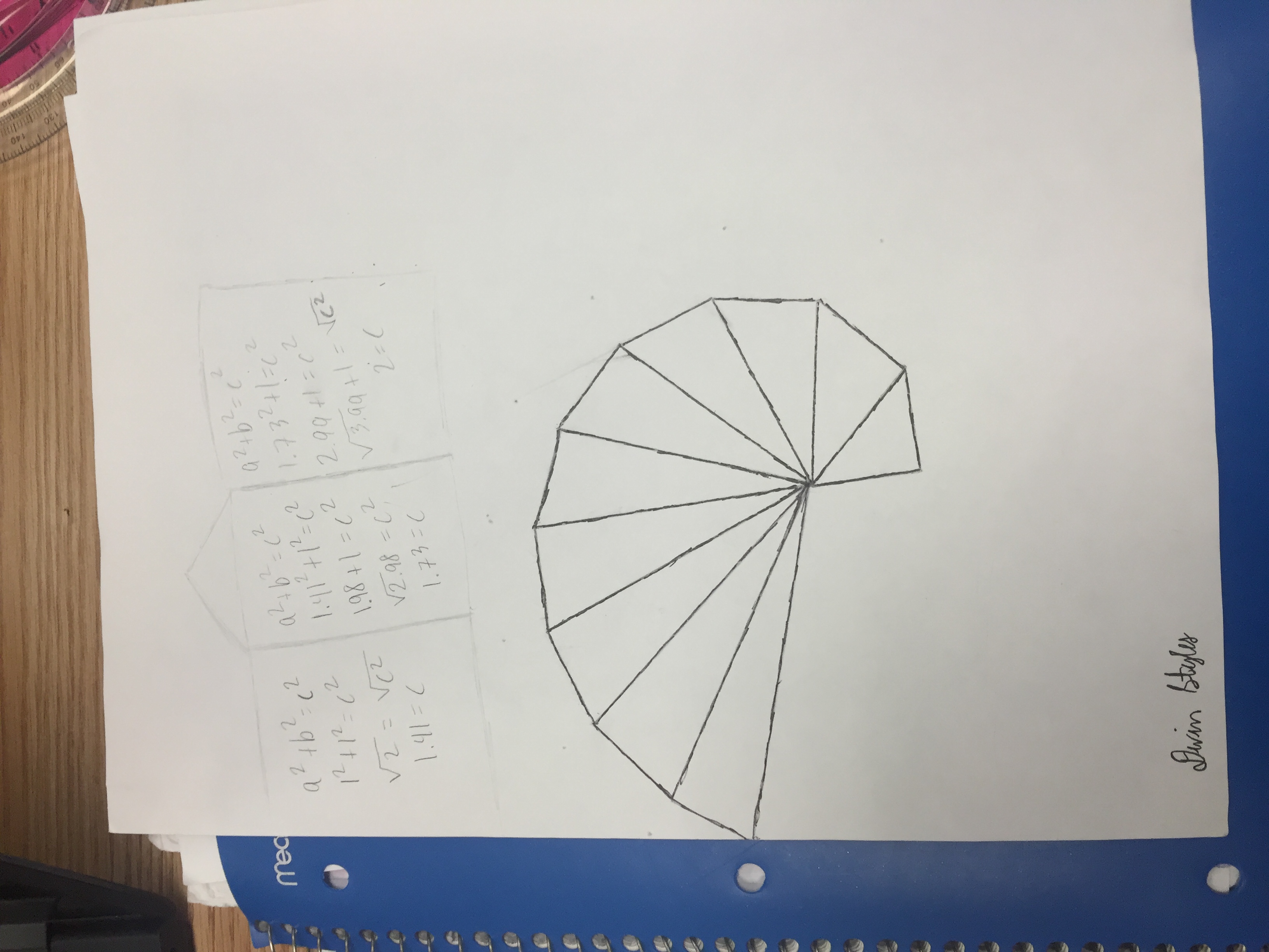 First I used a protractor to make a dot in the middle where the spiral would surround. I used the protractor to line up the triangles to the point at a 90 degree angle every time, I used the Pythagorean theorem to check that my triangles were correct. I made each of the triangles 1 inch toward the 90 degree angle which would then connect it to the next triangle.