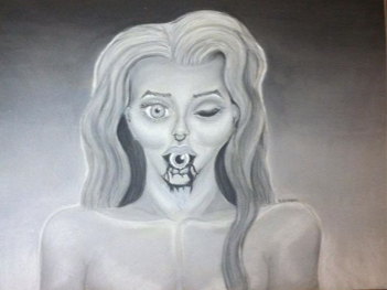 The creation of this work was spawned from processing the thought of how self-destruction could created serenity. I personally struggle with depression and have learned to embrace the beauty hidden in the dark as well as has many family member who struggle with addiction and tragedy and have learned mal addictive coping measures are a way to blind oneself from the troubles plaguing a mind rather than curing them. Art is a way to safely express one’s demons and remove their ability to weigh on you. It showcases the beauty in distress, rather than masking the issue and harming yourself further. I was inspired to put her removed eye in her mouth by a photograph of a model eating a cherry as kinda a cheeky nod to how the positive sides of modeling and sex are glorified as beauty masking the self destruction often associated with the industry such as eating disorders. The choice to make her naked represents vulnerability, and destroyed proportions are supposed to be semi realistic because this is how I like to represent people it is a strong theme through most of my past and present work. It is also in grey scale like most of my previous works I find it makes a more understated beauty rather than the conventional vibrant mixes of colors also I am more confident with blending chalk pastels in the same hue because it makes technique of shading and making things 3d looking easier. I learned that layering the different values of pastels is the way to go rather the applying the values then trying to blend them. This left the chest area a little streaky compared to the face. Layering is definitely the key for smooth transitions Looking at other modern artist I really resonate with the pieces of Ai Weiwei where he shows a man shattering a vase with a relaxed position i feel like it show case that destruction is the chaos in beauty. His pieces are simplistic but thought provoking and that’s what i strive for i want people to view my work and not feel uncomfortable or sadden but feel these complex emotions and realize the potential for beauty is just as much as positive emotions and therefore instill hope. I Don’t know if my work does this but I know that it’s thought provoking and that is satisfaction enough for me