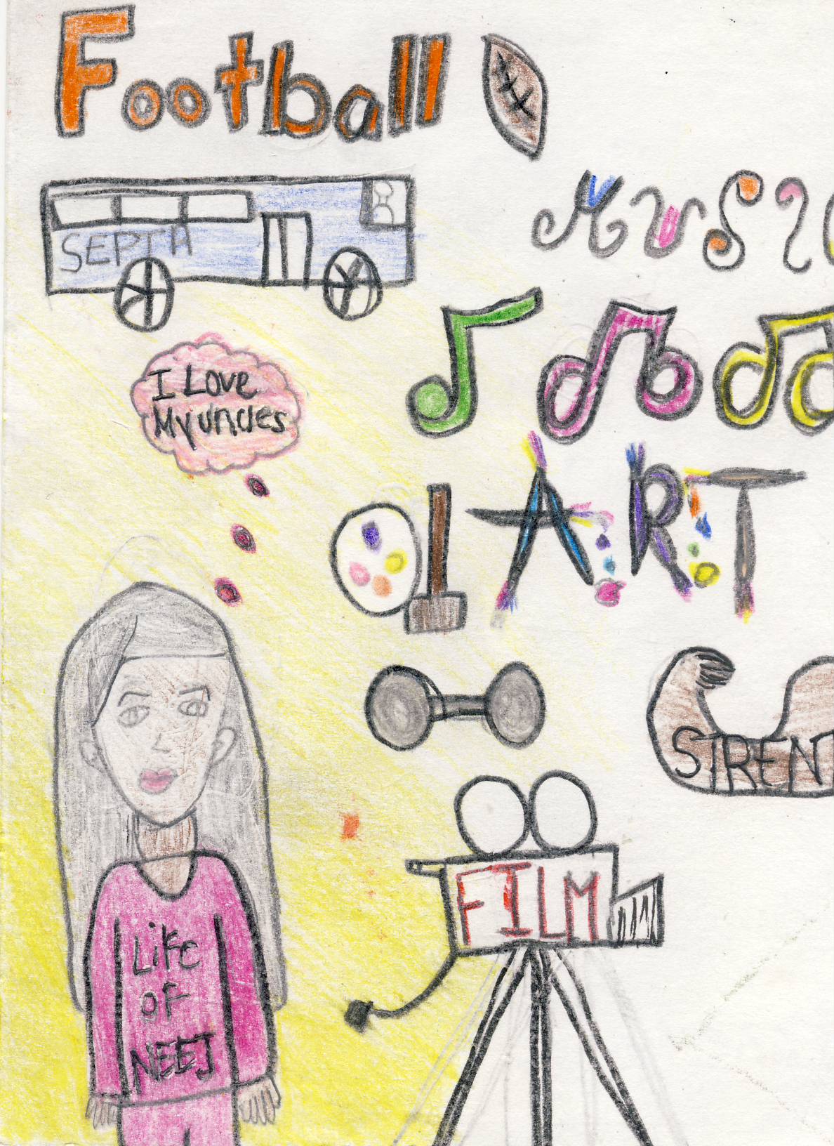 By looking at my drawing you can see different activities and jobs, while it still being colorful, vibrant and meaningful. You can see the reasons why they should be shouted out. In my drawing I put a bus because one of my uncles drive the bus for Septa, another is an artist, loves to sing and listen to music, one is a personal trainer, and another is in the NFL and plays for the Cleveland Browns. I chose to put their talents as a symbol of them and their worth. They all supported me since the day I was born and I wanted to show them that I appreciate them and everything they did and still do for me. The tools I used were pencils, color pencils, and pen. I used the pencils to draw out my portrait, then I took the black color pencil and traced the outline of my drawing. After I outlined everything I started using color, then I used the pen for the writing on my shirt since it was smaller lines. Lastly, I used a yellow color pencil to create a faded look across myself so everyone can see the main point. This relates to previous work because every time I do work I do it with a passion and I wouldn’t have this passion without the love of my family (uncles). The artist that inspired my work is Oskar Kokoschka https://alchetron.com/Oskar-Kokoschka-1270399-W. Certain techniques are important because as I started to color my body in yellow to bring it out, I notice that the technique of fading made it look neater. The technique| of neatness and accurate measurements are always good skills.
