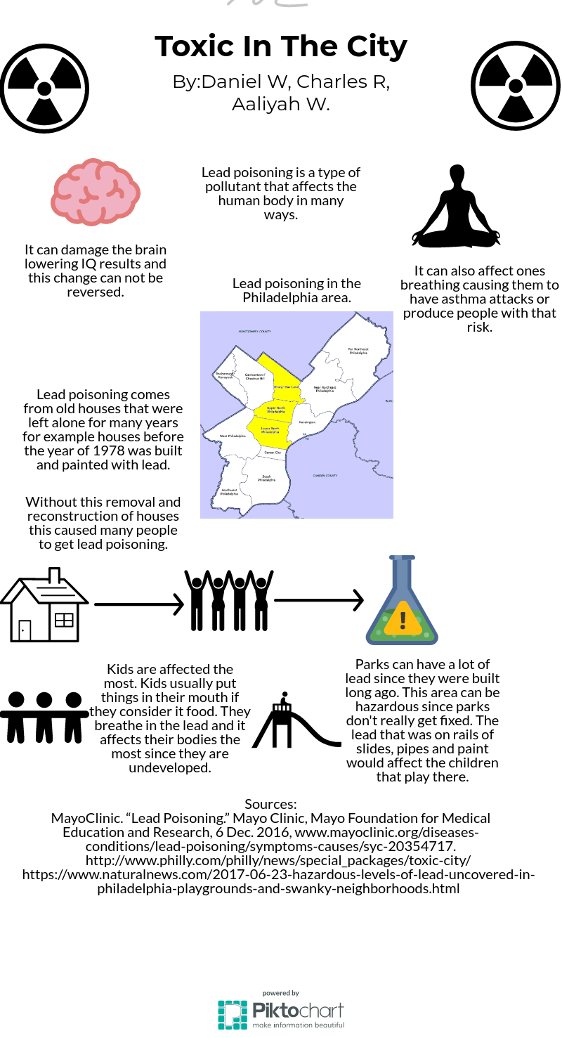Something that stood out to me from the reading as well as working on a project about lead poisoning in Philadelphia was the fact that this is an issue in Philadelphia. Before reading the article I had no clue that Philadelphia had an issue with lead poisoning. Something else that stood out to me was how only the children were being affected by the lead poisoning, I then learned that this was the case because children's immune systems aren't as developed as adults , also that children were in taking chips of paint leading to the lead poisoning. I was wondering if any adults were really affected and is there anything to help remove the poisoning from the human body after partial damage is already done to the systems.