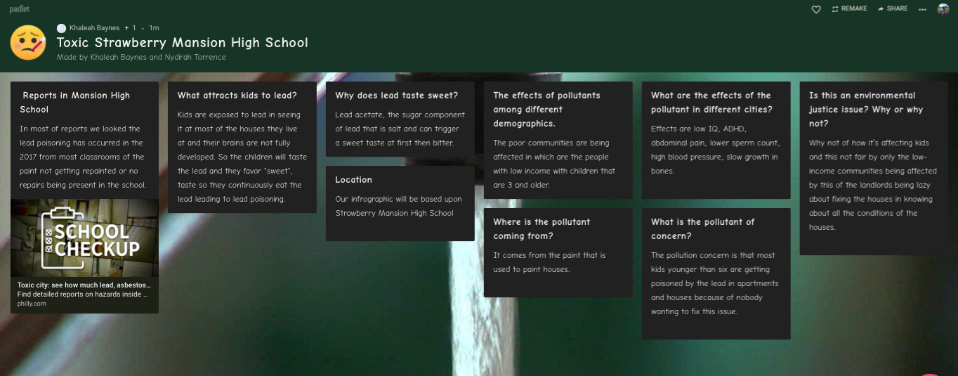 In our research in studying Strawberry Mansion High School, we found out that the high school needs serious repairs for the students to have a safe school that will not cause any health problems. By looking at the reporting of the school it showed that there are above average reports about the lead in the paint affecting classrooms in which includes pipes that were always affected by the spread of the lead. For example, on the website, the water in the fountain was affected by lead in which affected the students that would usually drink from the fountains. I still wonder about the other schools that might have these same problems and what the school district is doing about the spread of lead before it affects a wide range of kids in schools.