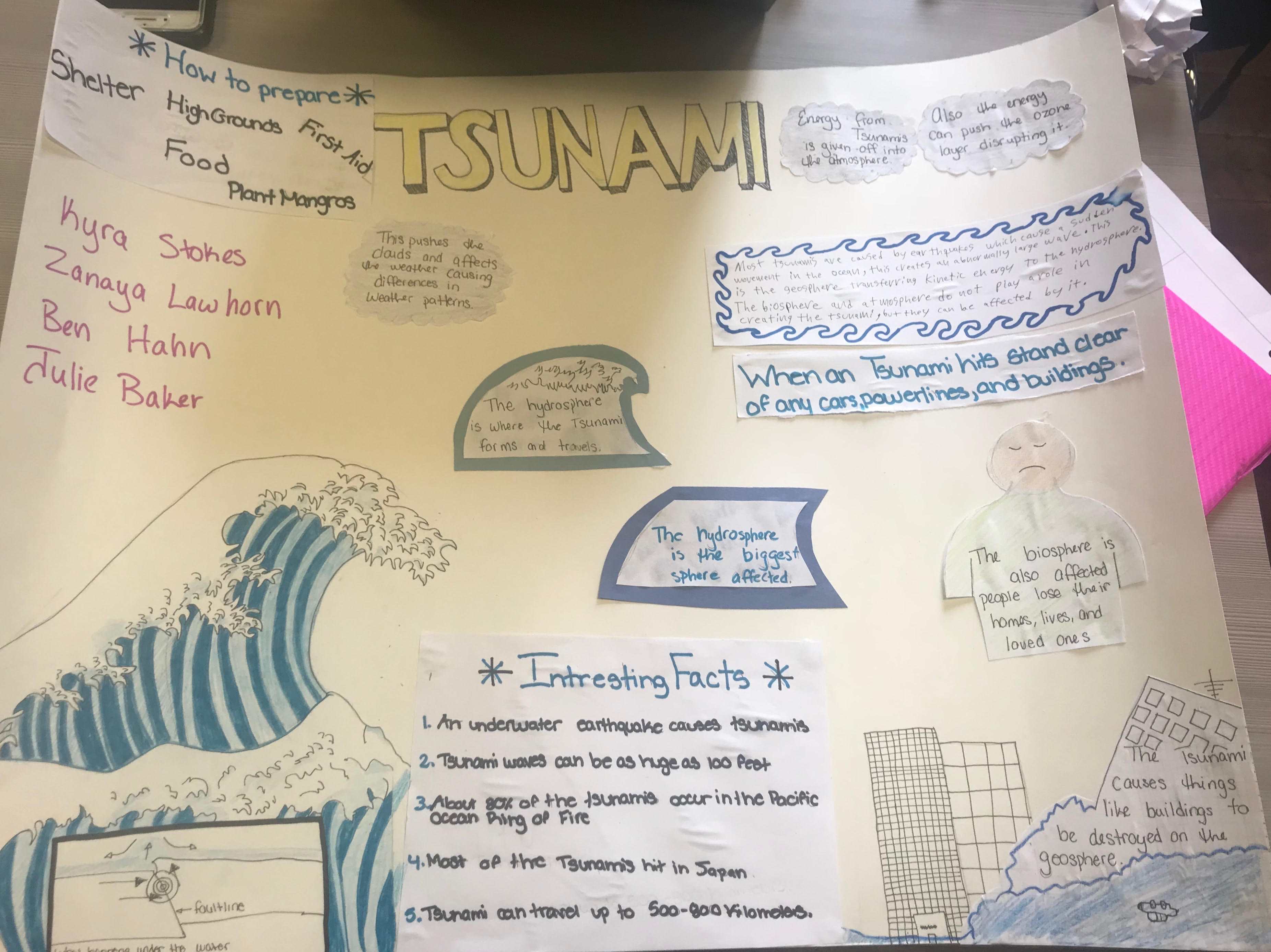 A Tsunami is a big wave usually caused by an earthquake on the Earth surface. The 4 spheres that make up the Earth's systems are disturbed by the disaster. The ozone layer, clouds (atmosphere), the ocean is forced from it's homeostasis to a raging destructive wave (hydrosphere), the land nearby is destroyed (lithosphere) , and the people nearby are dead or homeless. The kinetic energy that builds up in the wave starting from the earthquake is the reason the rest of the spheres are affected. People could grow mangroves and teach their young to take care of them, people can make shelter high up and overall be aware of their environment because they could possibly have a Tsunami in their area.