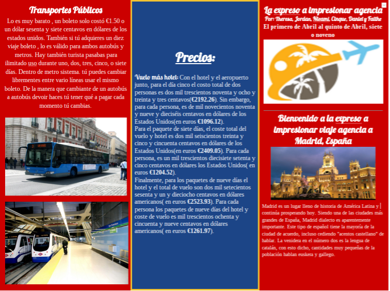 For this quarter 3 benchmark, it was focusing on traveling around the world. Our components were to do a brochure, a Powerpoint or Prezi, a commercial and a presentation. Based on the information of hotels, transportation, museums, restaurants, activities, shopping, shows, day life and night life of your chosen Spanish speaking country. During my time on this project, as a group I believe that we try very hard to use our time that we had. However, in the end of submitting this project, I did not submit the video on time. Meanwhile, this was a good project to see how hard it is to be a traveling agency.