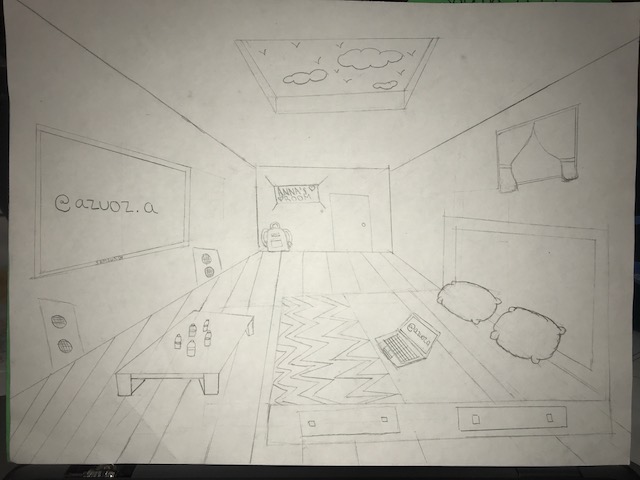 I drew my room, with things I want in it. My room includes, a skylight, window, bed, blanket, laptop, 2 pillows, my book bag, a TV, table, water bottles, speakers, a door, a poster with my name on it and curtains, drawers, and hard wood floors. I learned that everything goes back to the vanishing point. I'm proud of my drawling as a whole because drawling isn't my strong suit and it doesn't look that bad so I'm proud that it came out as good as it did. I wish I could improve my lines because they are a little sloppy. A tip I would give someone would be just do the work it's really not hard.