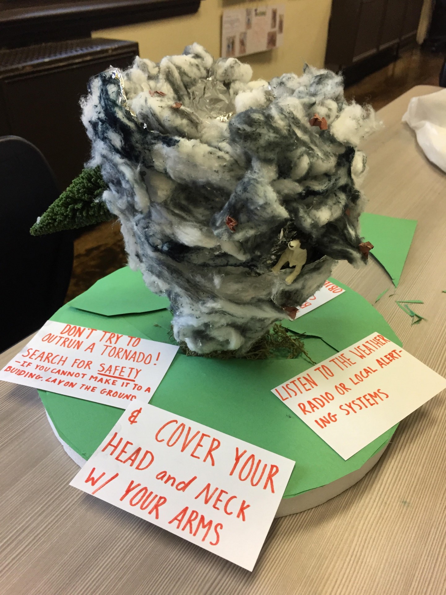 For this my group decided to create a tornado with cotton balls, tin foil, and a few miscellaneous objects. After a few glue burns to the fingers, we created a tornado on the geosphere with safety tips, as well as slides with each of our parts describing how tornadoes affect all of earth.