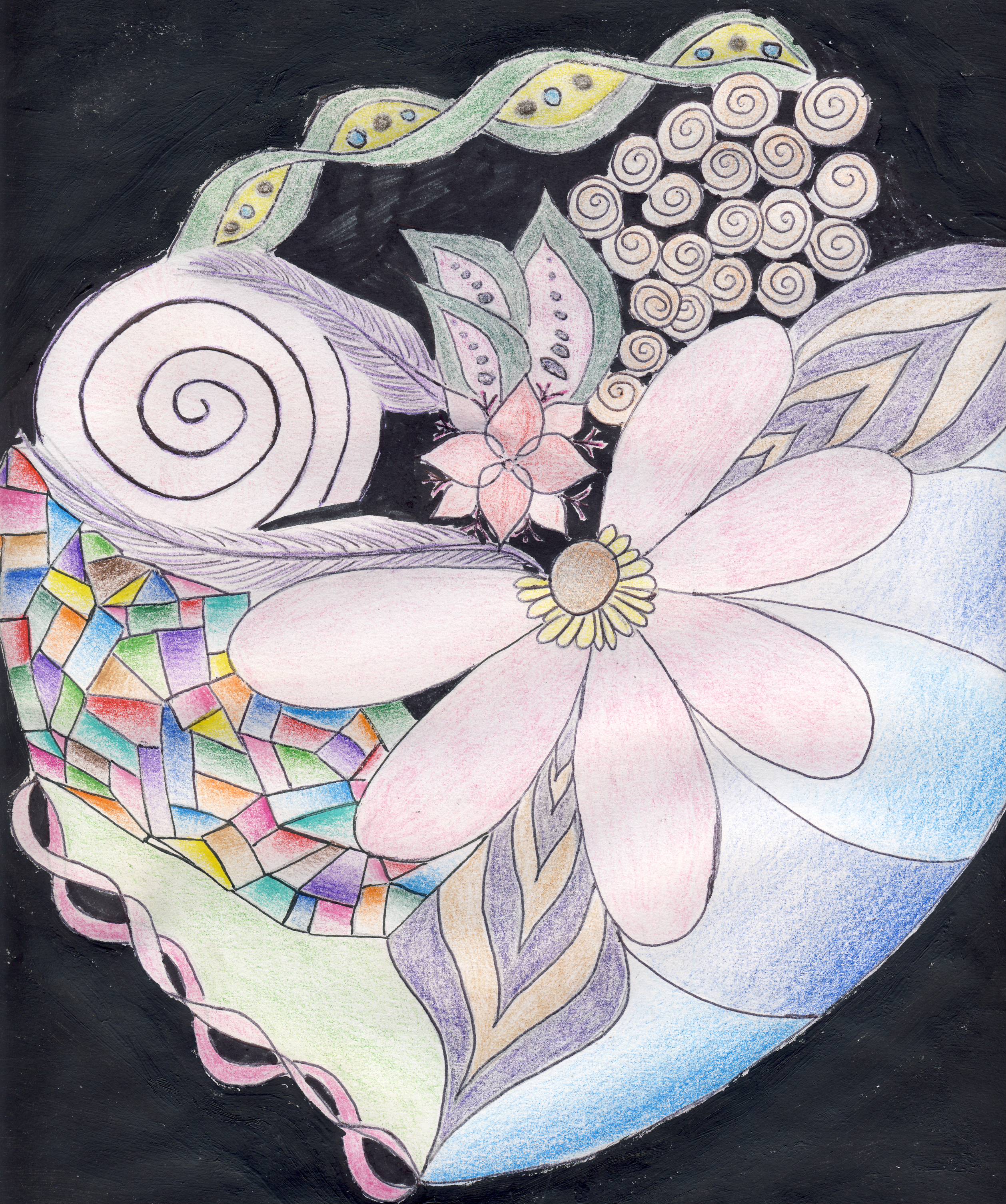The thing I am most proud of in this piece is the girl I drew representing me. I think I drew her well with good detail to tell what it is. Also proud of the things I drew to represent my emotions during treatment.