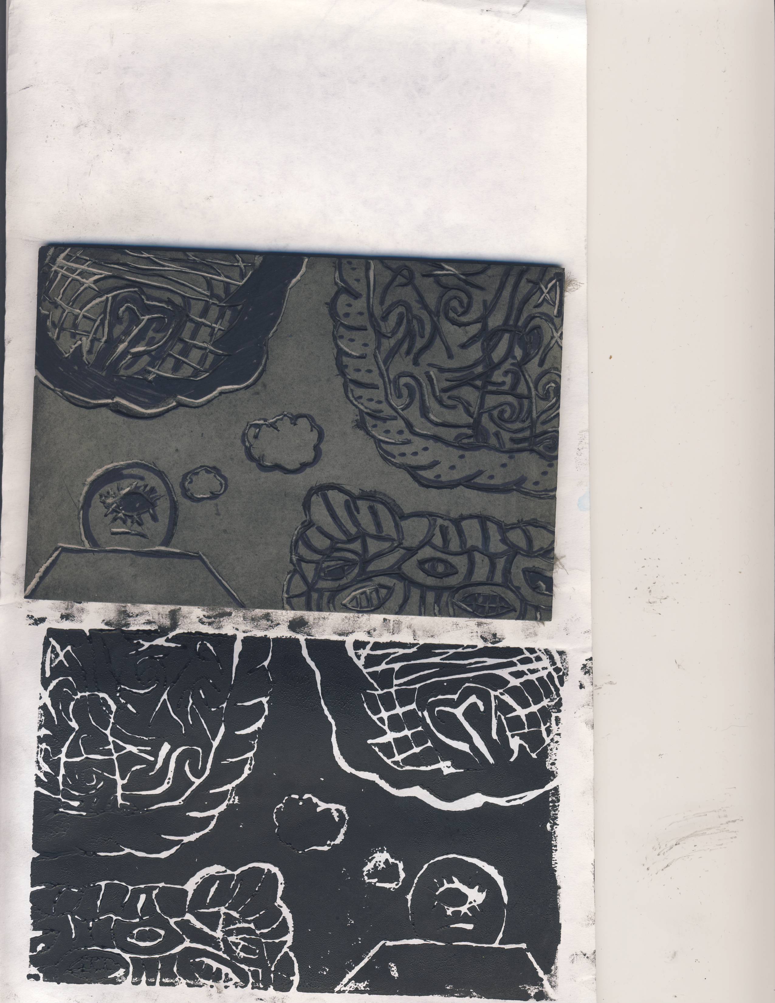 I always wanted to print my own really cool design. Honestly, I never thought past that so the design was not thought of until I sat down to do my sketch. This piece in particular is a result of my mind wandering. I could not think of a topic, so I thought “what if I base my work around my thinking.” This is why the work outside of the creature thinking is very abstract: half of the time when I’m thinking I may not be thinking of anything at all, I’m really just zoned out and really heavy into my mind at the moment. I wanted to portray this in my print and I feel as though that went well. I believe it even conveys that exact theme perfectly as my peer reviewer saw my work and instantly thought “Is the title ‘Imagining’ or something like that?”