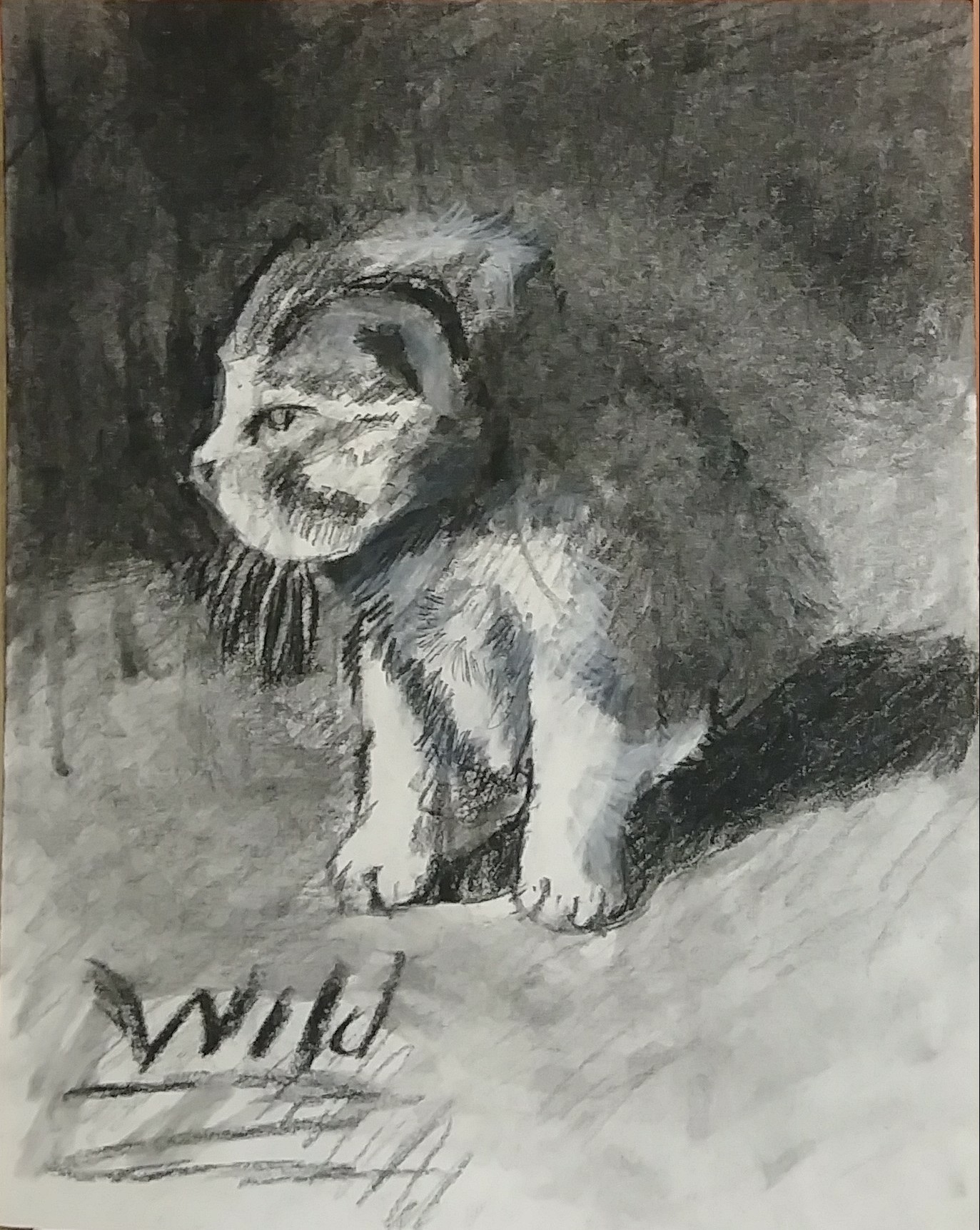 The use of the chalk and then the charcoal to make the lighter greys is integral to the piece, without it the true hinting of the colors of the cat wouldn’t be able to show.