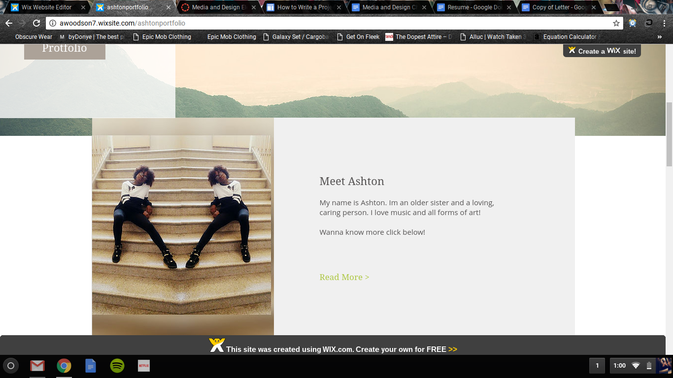 In this project I created a website for media and design class. You will see things like what I do for fun, school projects and what I have planed for my future. In this project I hoped to learn how to build a better website for future reference. While doing this project I learned just that but I still have things to learn and work on. This project was very eye opening! This project was somewhat of a long process. We had many checkpoints leading up to the final submission. First we had to complete our homepage. We had to make it look eye catching and easy to navigate. After that we had to work on the following pages to complete our website. Homepage, About me, Resume, Project those are the thing we needed to complete it. Adding a contact page was optional. I added a gallery page which included pictures of me and things I mentioned. I did that because I felt like I didn't have enough pictures on my website. This is basically the process we had to take to complete this project.