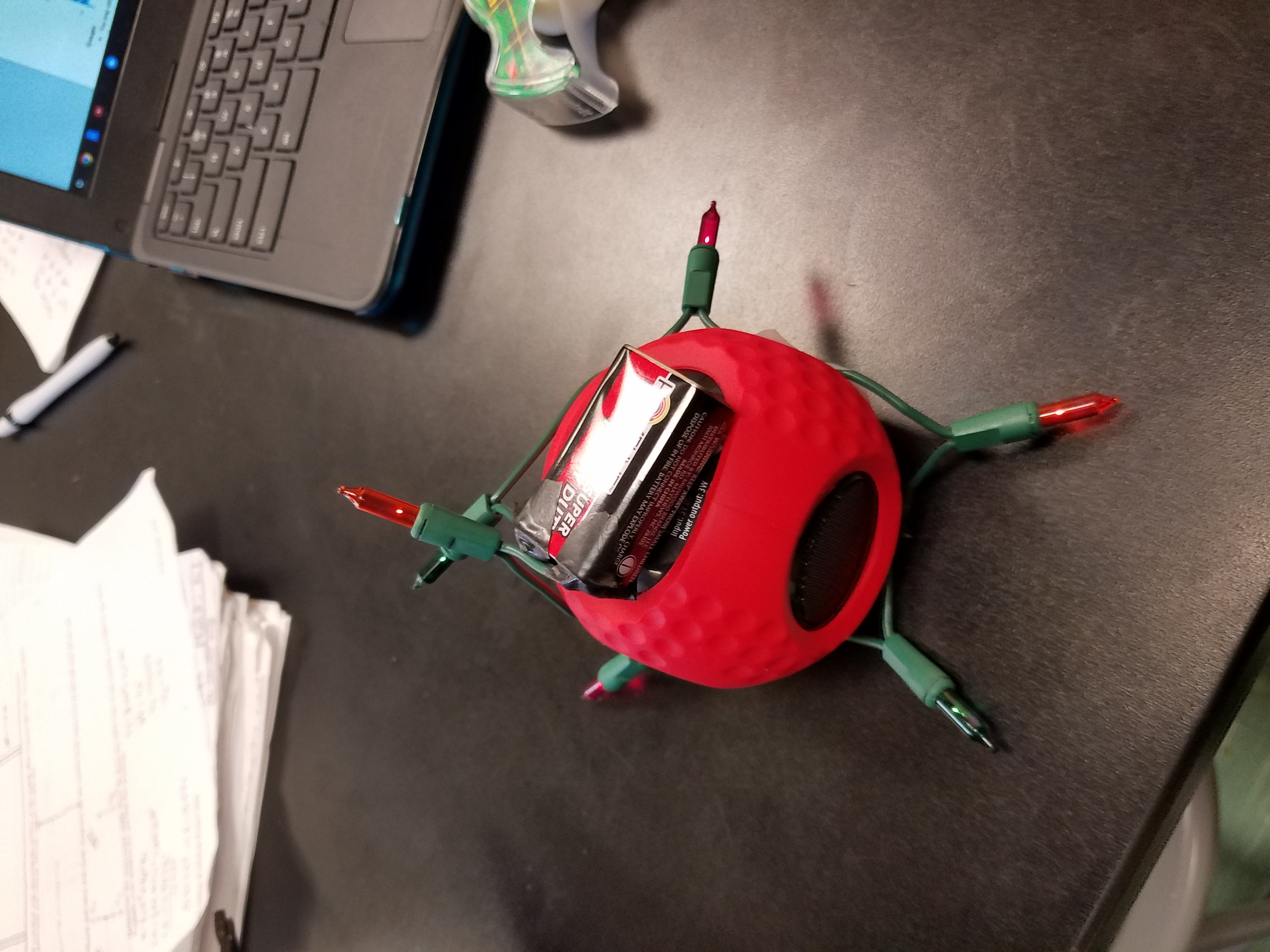 We chose to make this project because we felt like it would be cool. This project tells us that we like to make cool stuff. The project contains a speaker, a 9v battery, and 6 lights.It was also a fun project