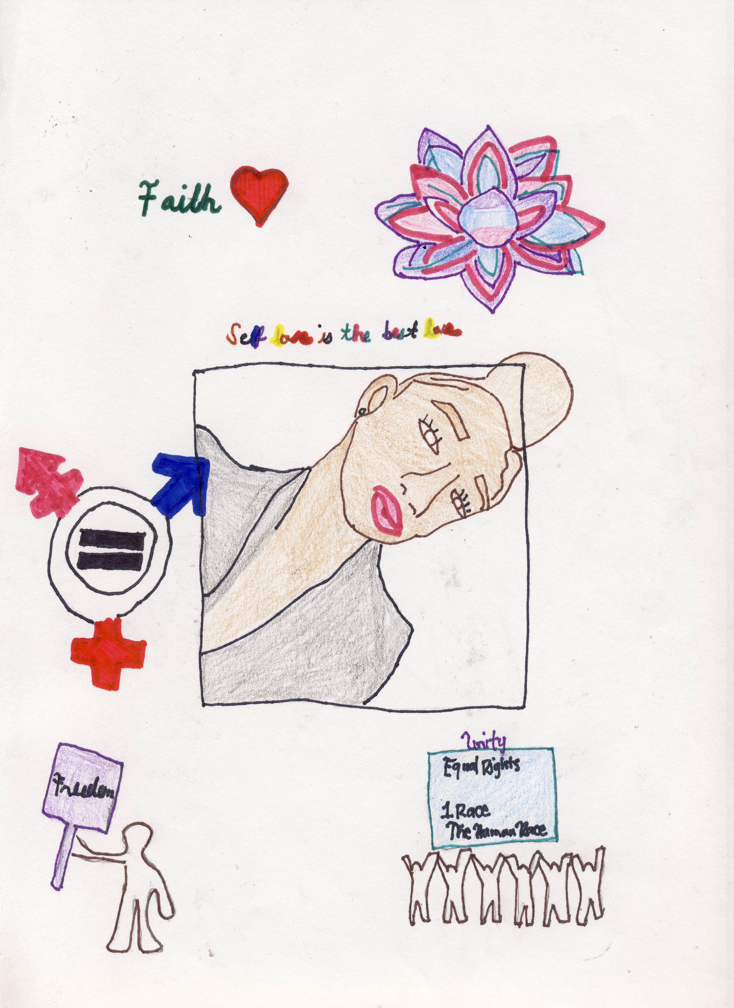 For this quarter 4 project in Art 2 I drew a picture of myself based in the style of artwork the artist I studied have done, I included different symbols that had some importance to the world like freedom posters, people holding hands to show unity. I included worlds like faith, an equality symbol, and a lotus flower. I drew this artwork to show what I reflect on and what I see in the world.