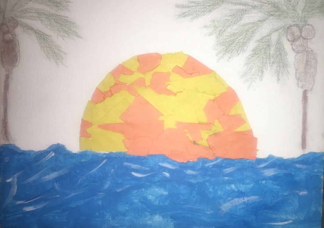 outside of my comfort zone and tried something new. I gather my materials first which was difficult because I couldn’t find three different media that was going to work on the board I was using. Then I sketched out my sunset on the board. Then I painted the ocean first.I used acrylic blue and white paint. Next I filled in my sun with 2 different color constructions paper yellow and orange. Lastly I used a white substance and filled in my palm trees then I went over it with color pencil brown and green so it can really show.