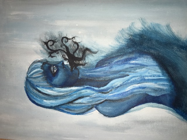 Overall I think I achieved my goal and others will read the sense of confusion, loss, and acceptance but I think it's one of my weakest acrylic paintings. I have similar pieces and some are worse but most are better. I think what caused a lot of the problems I encountered was the original sketch I struggled a lot and changed the position of the subject to many times. I also had trouble with over thinning the paints with water on accident making parts patchy but at the end, i got the hang of it. I think my blending and shadowing needs improvement. They are also very important to adding dimension to a painting which parts of mine have and others don't. I began with a sketch on the canvas then, painted the background and began to block in color then added in detail layer by layer.
