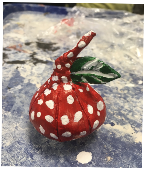 To create this artwork I was inspired by an artist that I studied in my previous project. I studied Yayoi Kusama a Japanese artist that loves dots. When looking at her work I gravitated towards the pumpkins more and decided to re-create and add my own twist to her original design. When doing this project I had a lot of trial and error but,I realized that you need patience, also a good structure. With having a good foundation for your work it will help everything go more smoothly. As I continued to work on this piece I learned a new technique that helps me the rest of the way. It was having the newspaper to help create texture and take away excess clay. As t neared the end I grew proud of my unplanned leaf and how it pulled the pumpkin together. For this project, I don’t think that I would want to change anything. I liked the way that my idea came together in the end. I learned that I liked adding my style to a previously own idea by a famous artist. With me adding my style to the original and seeing the difference showed me what I can achieve.