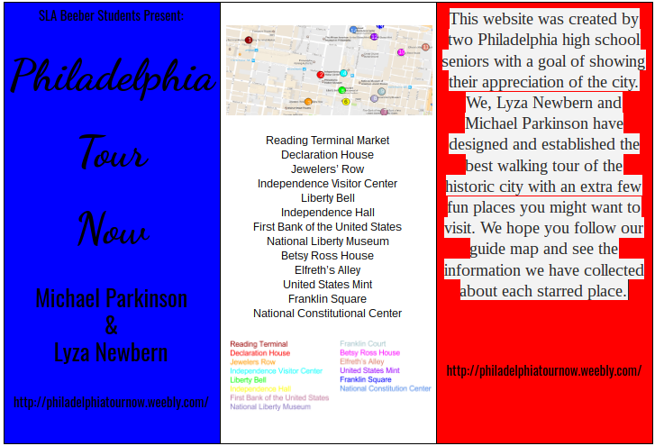 For our capstone, we chose to utilize our city around us. Where we grew up and continue to live is very important to use, as it is a large city which many people aspire to visit one day. We wanted to utilize our city to create our lasting legacy at Science Leadership Academy at Beeber. Our final project was a website which high school students, adults, and visitors can use to find places to learn about the history of our city. Included in each page on the website is a source of the actual place so they can do additional research. As well as doing our own research we created an ideal walking tour which the visitors of the website can use as they please. This was actually an interesting experience for us because not only were we learning more and more about places in the city and the history around us; we began to feel like travel agents planning a families vacation in a city that we are used to. As well as creating the website and conducting research, we created brochures that could be handed out around the school and neighborhoods. We hope that you enjoy our efforts to spread the love for our city and its extremely interesting history!