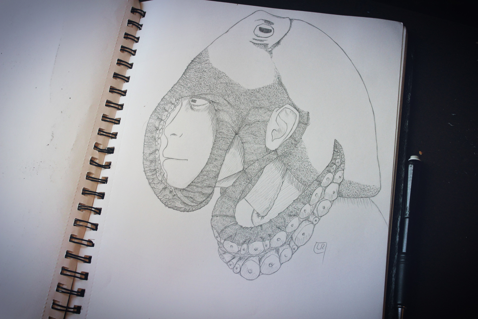 The way I made this is not particularly different than the way i’ve made other pieces, I quickly drew a profile a female and then pulled up references of an octopus, and drew from those to get what I wanted for the piece. I used stippling and crosshatching all along the octopus to create the rough surface they have on their skin, and kept refining my linework until i got to the product I have now. The most important technique used here was stippling which took the majority of the time to do but i’m satisfied with the overall effect of it.