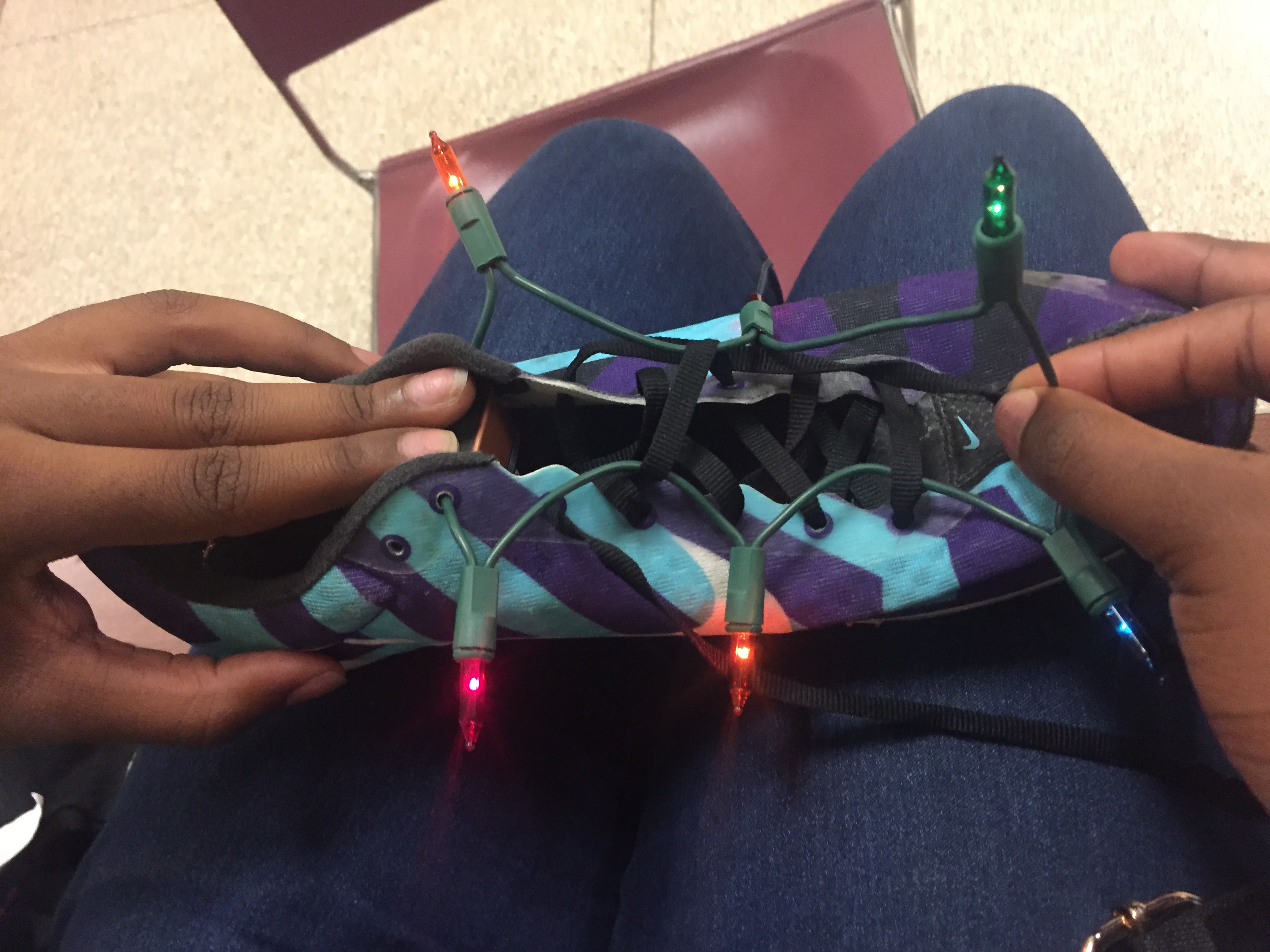 For my electric art project I made my track spikes light up. One of my dreams is to become an olympic track runner. I feel like track helps me relieve stress and push myself to the hardest point. Making my spikes light up also makes me feel like I am a star. I will be using my first pair of spikes because they are worn down and they show that I actually am dedicated to the sport.