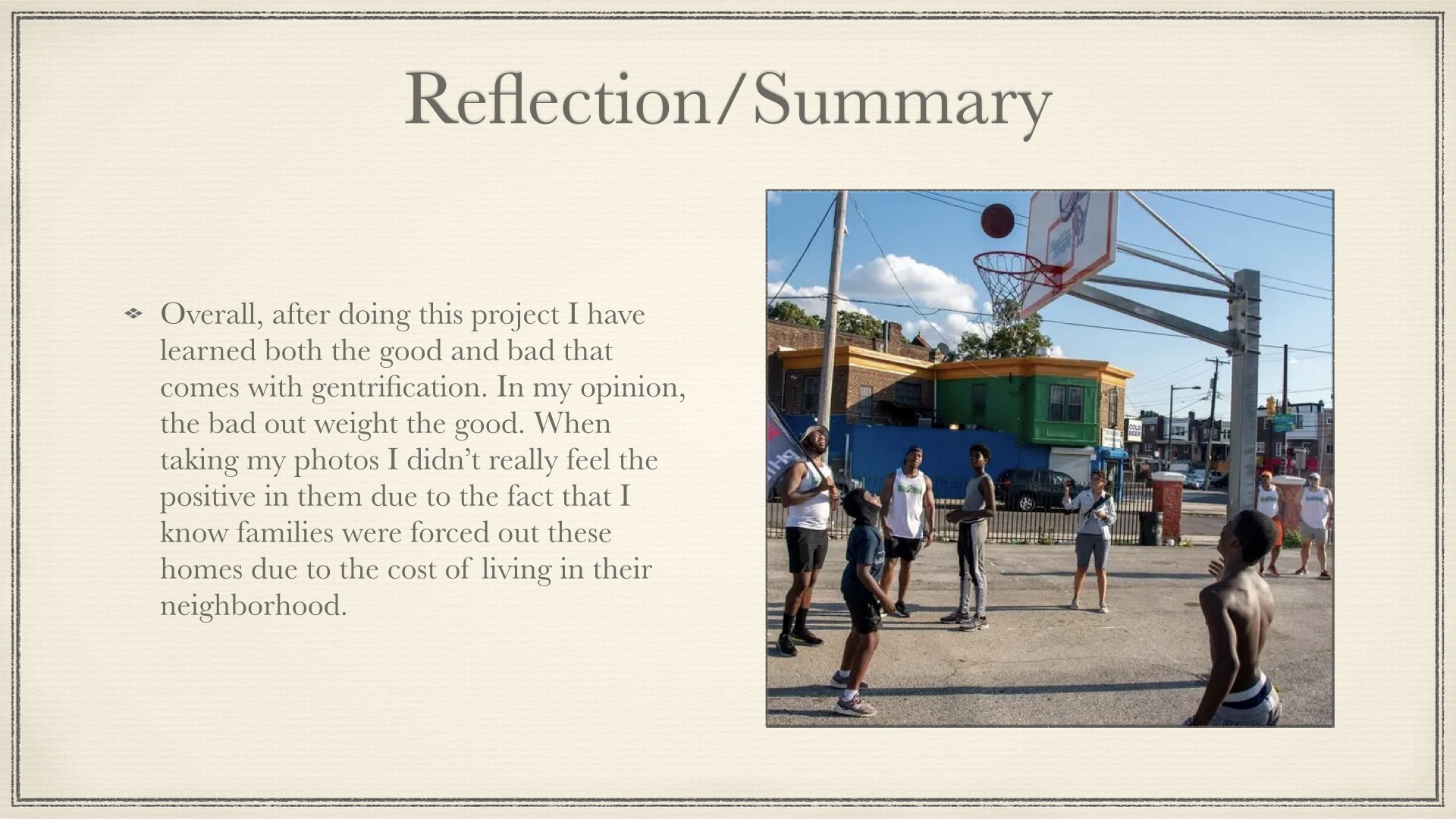I completed my capstone project, and as part of it, I photographed gentrification in several places. Within the images, you can examine the underlying meanings of things such as how everything is being swept away and we are starting over, which may be beneficial to some but harmful to others. In today’s society, we are okay with removing history and replacing it with new items in order to meet an aesthetic, which is absurd because neighborhood standards have shifted dramatically, both physically and financially. We should start looking about and paying attention to our surroundings since things in our communities change in the blink of an eye.