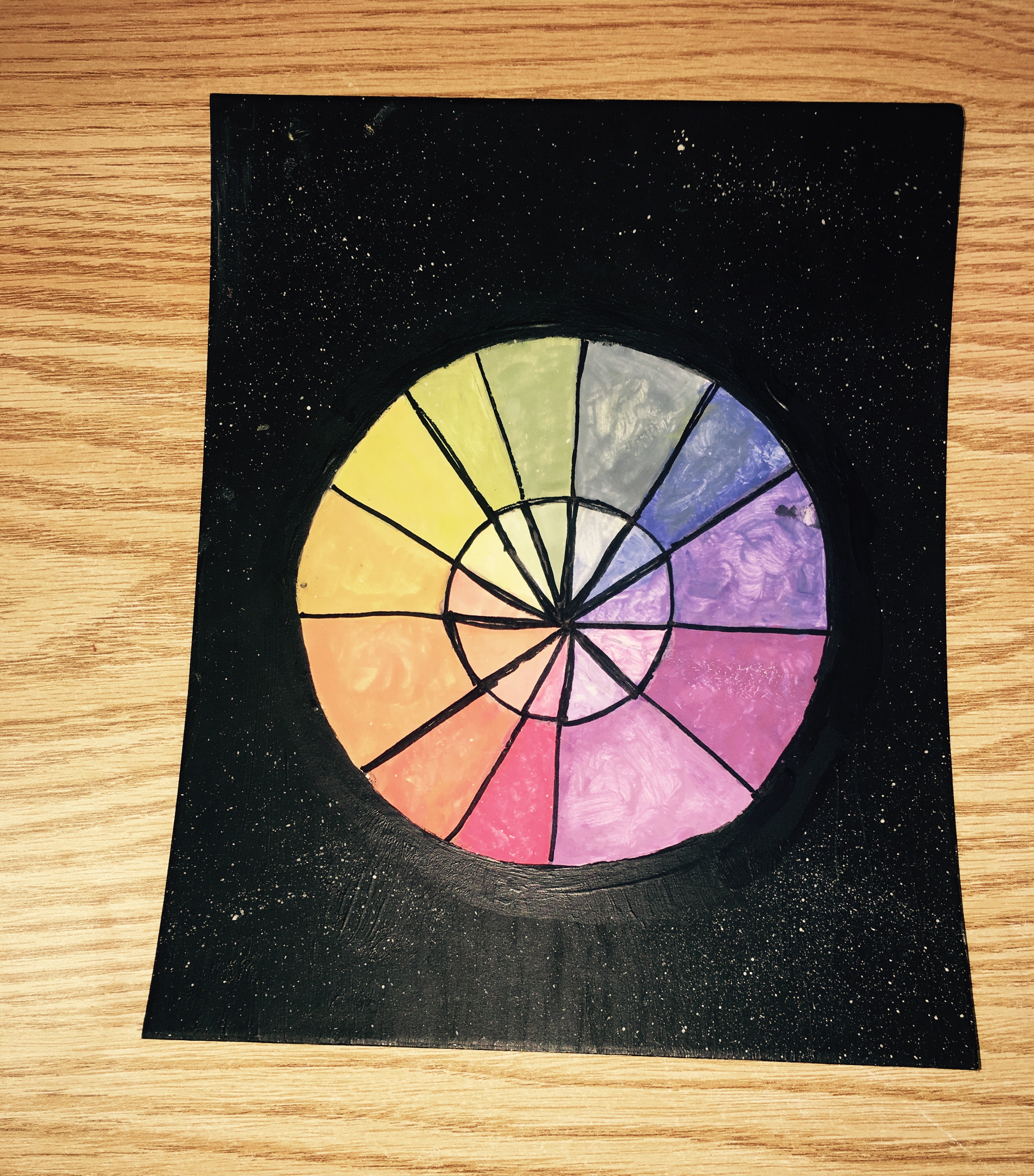 Creating this project, I knew my choices and variety of creativity had not limits. Although, I was inspired by the original color wheel, I liked the plane feel of it so my colors could stick out. To give my project my name I wanted to add some originality to it by adding a solid black background and white splattered paint.. This gave my project an edgy feel. While working, my routine/technique was to do the primary colors first then work on secondary colors because I knew since I had such a small space for painting I was bound to mess up.