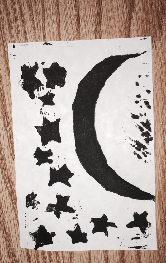 For this project, I decided to re-create the linoleum outline. I had the outer of my picture all white and then traced for the rest to be covered with black ink. I used stars and the moon because to me they are very peaceful and have a bigger meaning to me than just a moon and stars. Although this project was fun doing I can say it was hard. I had trial and error a few times until I was satisfied with what my results were.