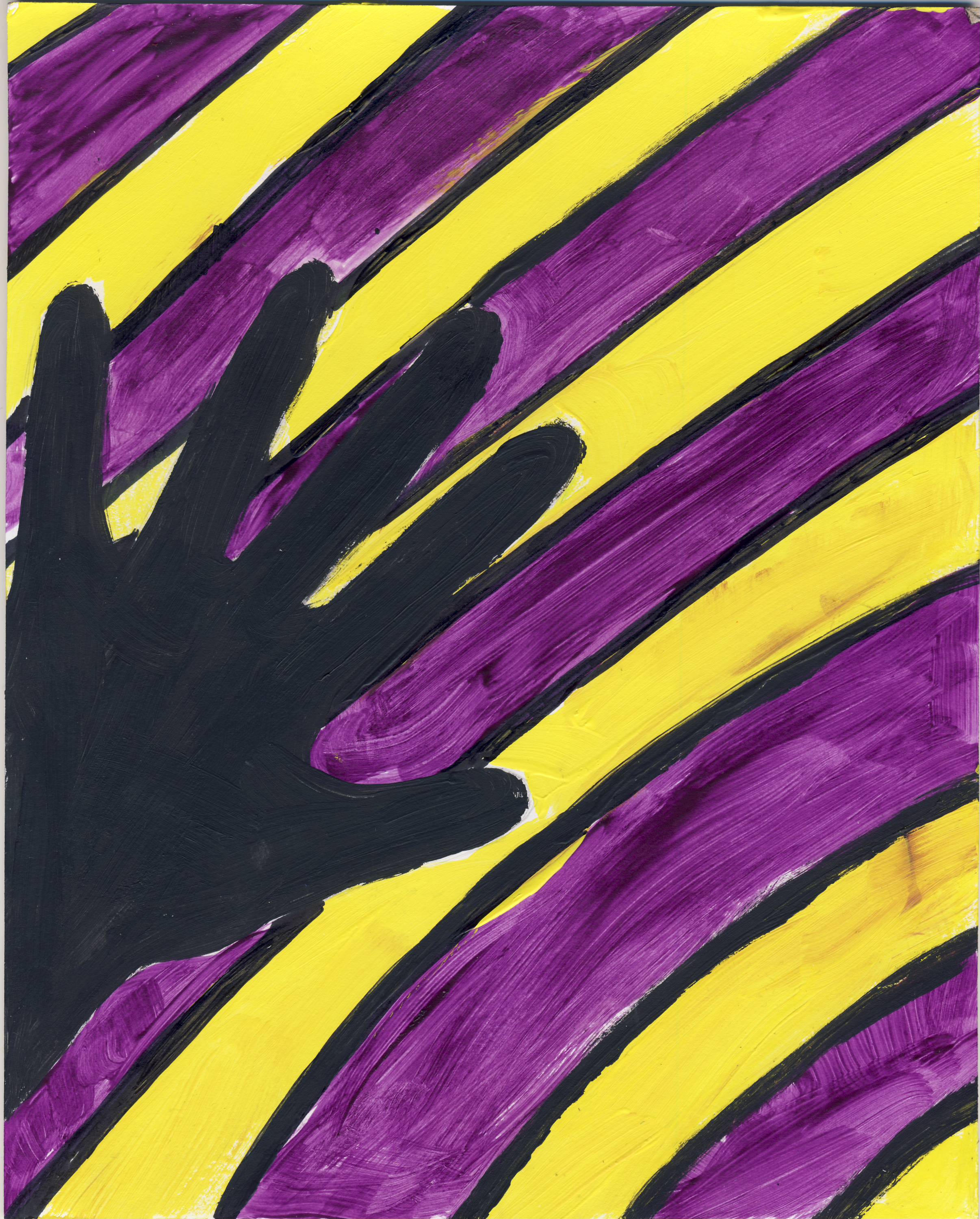 For my project, I decided to work on Cornelia Baltes’s artwork. She is a unique artist and her artwork contains different colors and shapes. For this project, I decided to go out of my comfort zone and do a design that was similar to Cornelia’s. I decided to draw a hand and next to it, it was different stripes. The colors I used was Yellow, Purple, and Black. The reason I picked yellow and purple is because the purple makes the yellow pop and the black was for outline. I started off sketching with a pencil and later when I was done, I use acrylic paint. The colors and shapes with similar to Cornelia’s art. There isn’t anything specific about the hand, I thought it would go together and it did. The one thing I would change about they project is to probably use another bright color.
