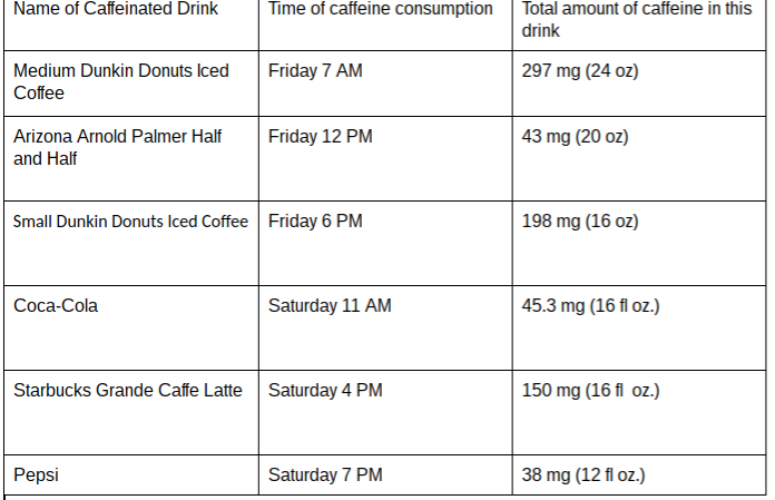 For example, I recorded six entries of the amount of caffeine that I consumed in a 48-period starting at 6:00 am. I gathered all my information and got the following results in the table below