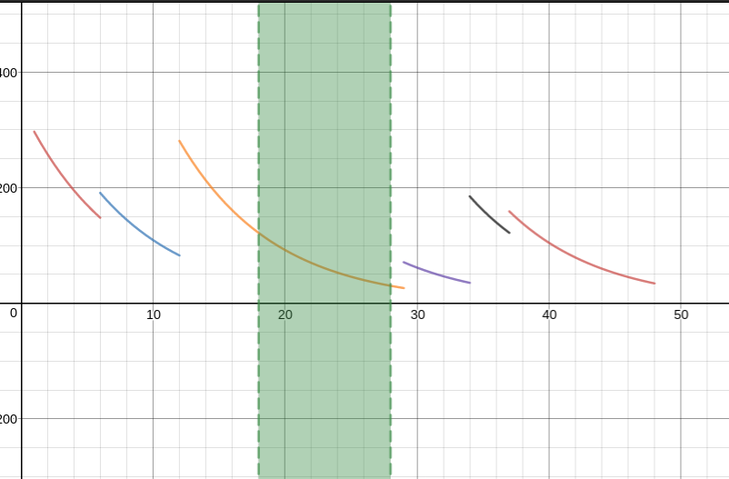 As you can see I used the exponential equation each time I consumed caffeine. For each new equation the ratio of change is 0.87 because that’s how much caffeine is left in your body in each hour (13% of caffeine leaves your body every hour). The exponent in the equation I subtracted the number of hours since the start of the day by T (x). I used the curly brackets to show how much caffeine decreased each time I drank something, to show when it stopped.
