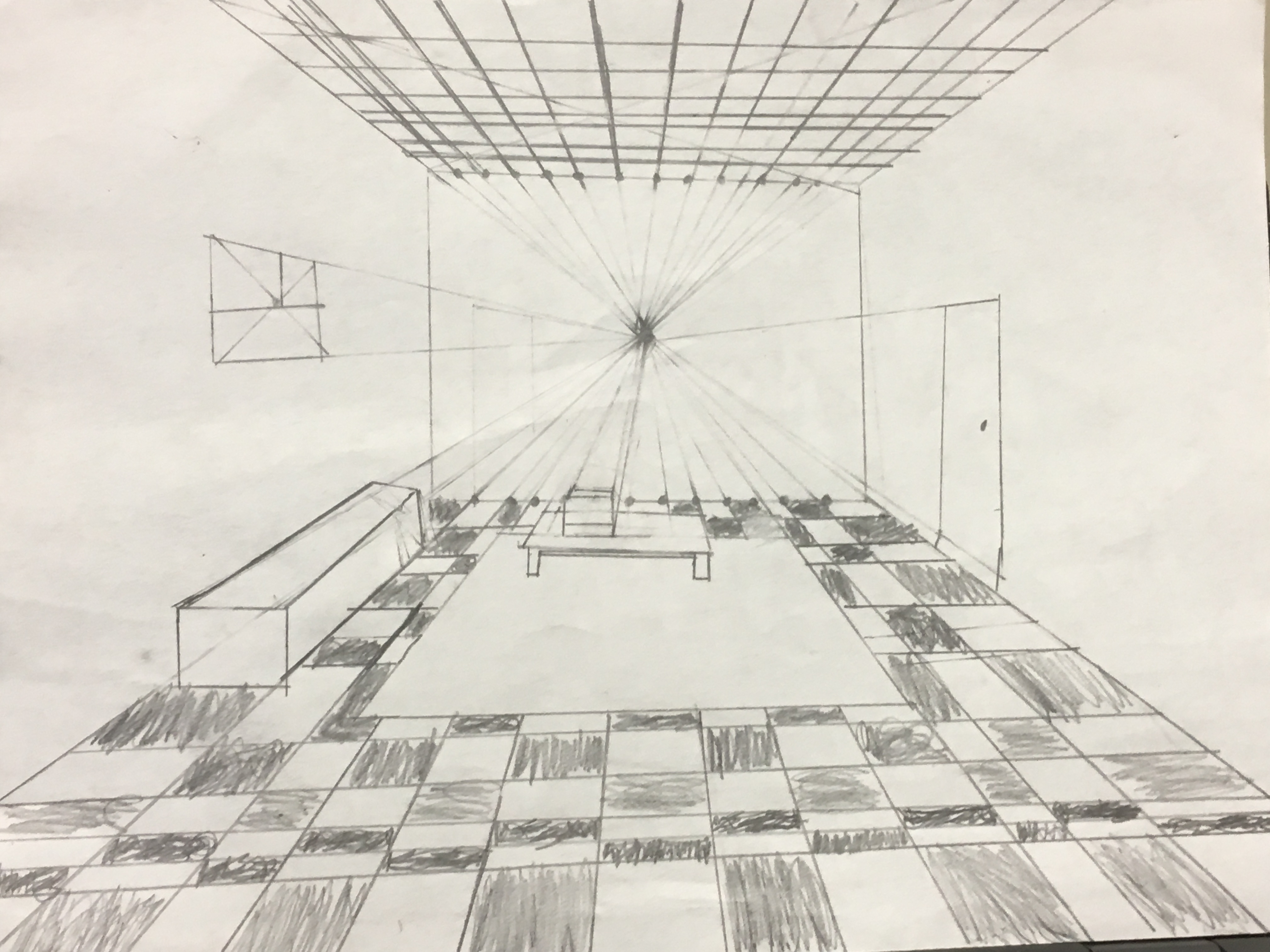 In my drawing I tried drawing a T.V on and a table and bed. I also tried to a checker floor. What learn about point perspective is that you need it to make 3-d drawing. The one thing I was proud of the ceiling and the floor I think I did well in. One thing I wish to improve on is my bed is looks like a brick. A tip to the new freshmen is to use the website because it make s the project much easier.