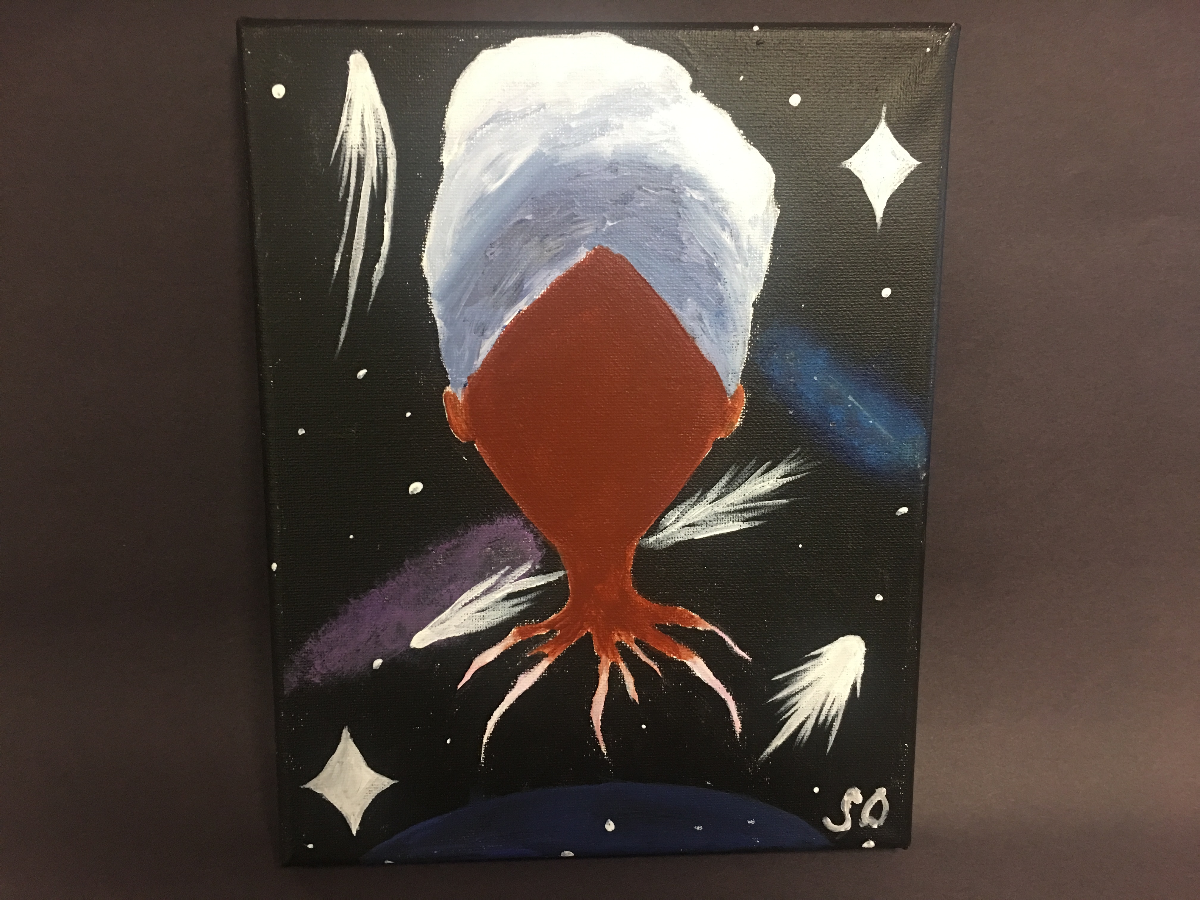 I’ve always created pieces that were meant to catch an observer’s eye and that were mainly about black women, since I’m one myself. I’ve made basic galaxy pieces before, but I never knew what to make the main focus of the piece. I actually have never seen an artist do a piece like me and it’s hard to think about a past artist that has similar work, since my piece seems like a more modern style. There are some things I need to work on like shading, making the stars look like stars, and the distant galaxies look like galaxies. I’m most proud of the scarf on the girl’s head; the ombré effect that I gave was meant to just fit into the whole piece. I’d change the shooting stars and the planet below the girl. It was all kind of rushed, so it wasn’t the best I could do.