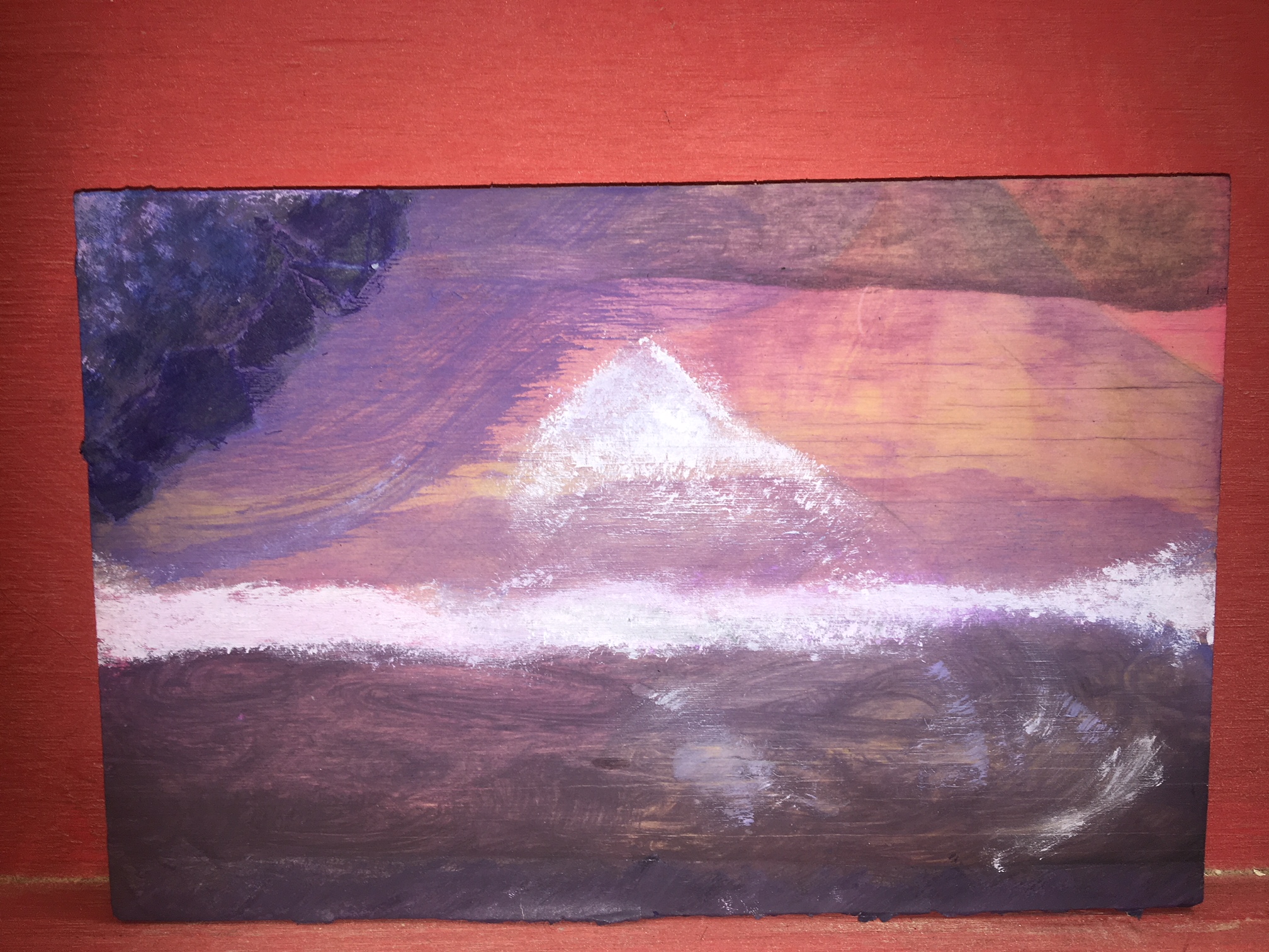 In my art work there are many different colors used to represent things. The bottom of the work has like a brown mass that is supposed to represent water. Then there are pink type clouds that has a mountain structure in the middle of it. There is also this blue wind sweeping over the mountain. The sun is a blue circular figure to the side in the corner. I want the work to communicate whatever the person feels looking at it. The wind, ocean, sun and mountain can represent different things to a person while looking at it. For the painting I used a block of wood as my canvas. I used tempera paint, newspaper and acrylic paint. The tempera paint was used for like everything and layered of the newspaper for part of the ocean and the sun. The acrylic paint was used to make “snow” on top of the mountain and used to add some white details in the ocean. My current work is like my previous work because both of them are like whimsical in a way. In both works nothing is supposed to be the color that it is. The process involved for my work first started off with me making an outline on the wood for what I wanted the painting to look like. As i began painting with the outline I quickly realized I did not like and another vision popped into my head. So I started off with painting the ocean and the mountain was a leftover thing from my previous vision. So I added a sun using newspaper for texture.