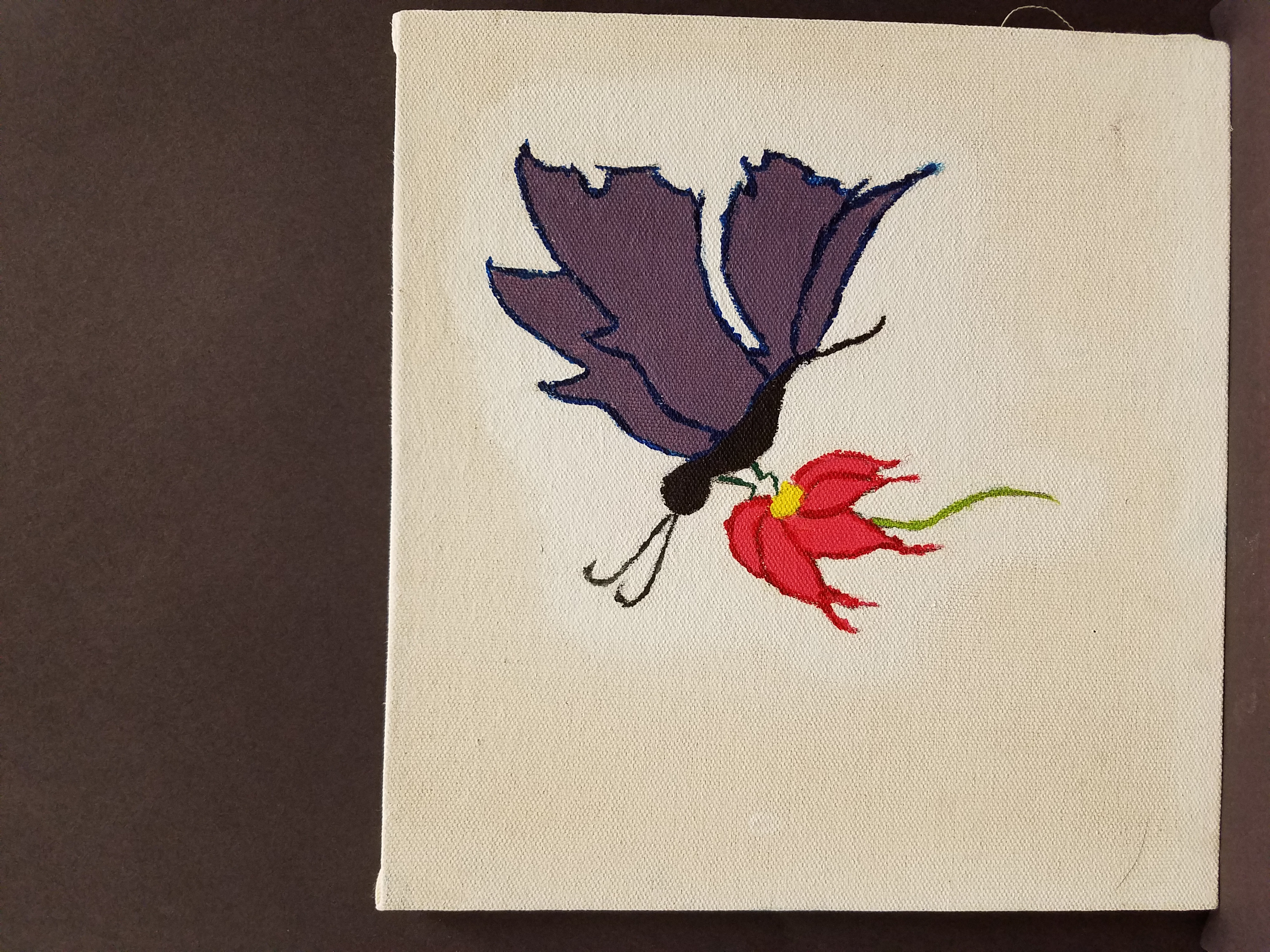 My art piece is a butterfly gracefully sitting on a flower. I tried to make the color scheme more on the dark side but I did end up using some brighter colors to color the flower. I used a dark blue and purple to paint the butterfly, while I used pink, red, green, and yellow for the flower. My art has some similarities to my previous work because this is a limited palette painting. The painting was supposed to come out elegant but once I added paint, it kind of ruined any good parts about it all.
