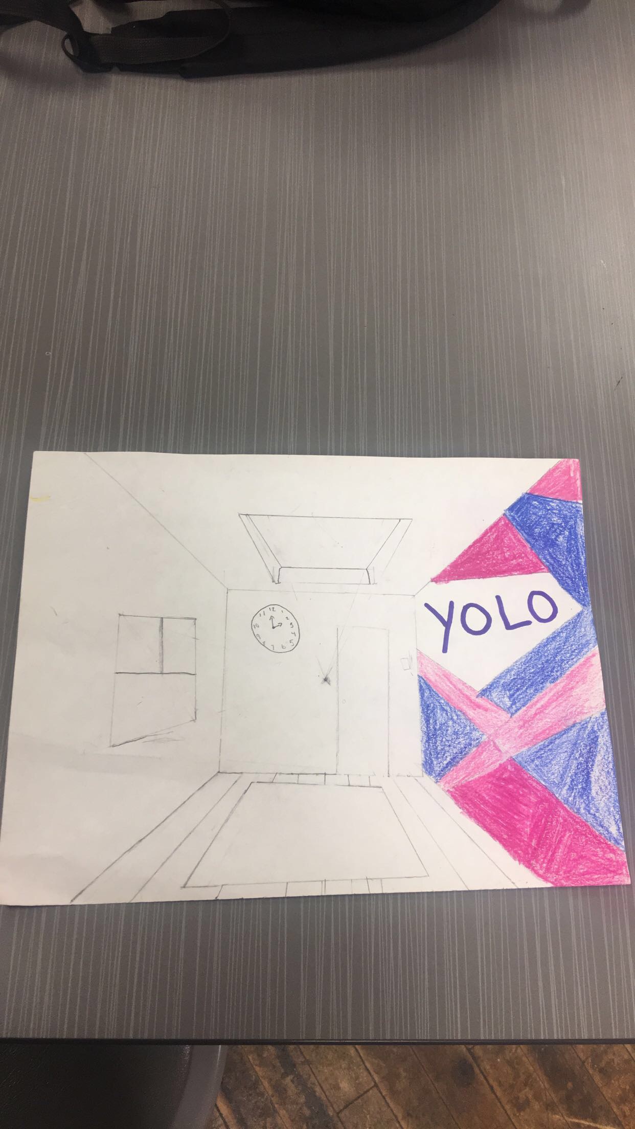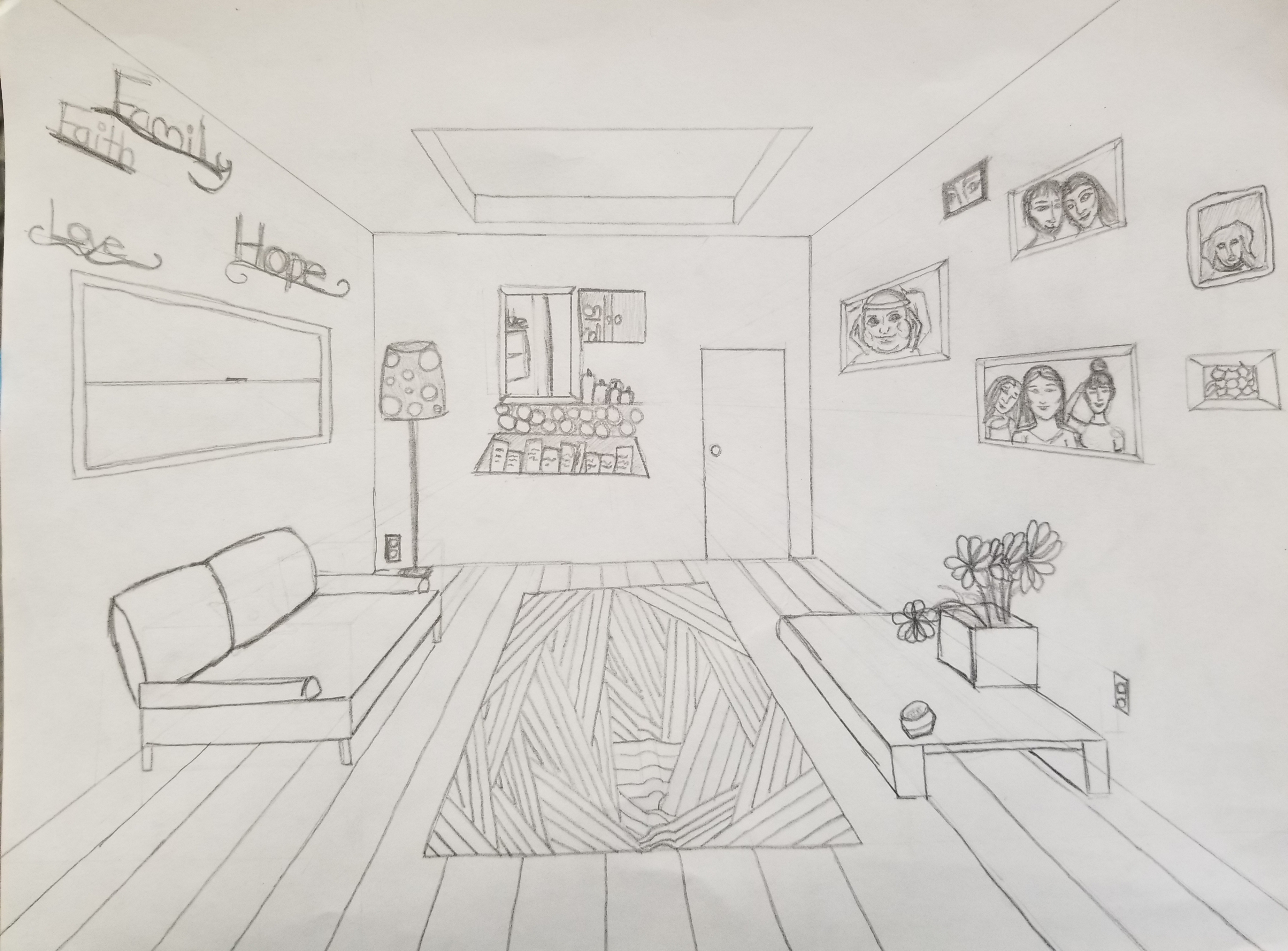 I drew a bedroom from a one-point perspective meaning the drawing is directly facing the front. I learned that there are many different objects you can draw in one- point perspective. I also learned that when you draw in one point perspective you have to make sure your lines are precise because if they are not then your object won't come out the way you want it. I am most proud of the wall in my drawing because it's colorful and meaningful to me. I wish I could improve the neatness of my lines. One tip I have for someone doing this project next year is to pay attention.