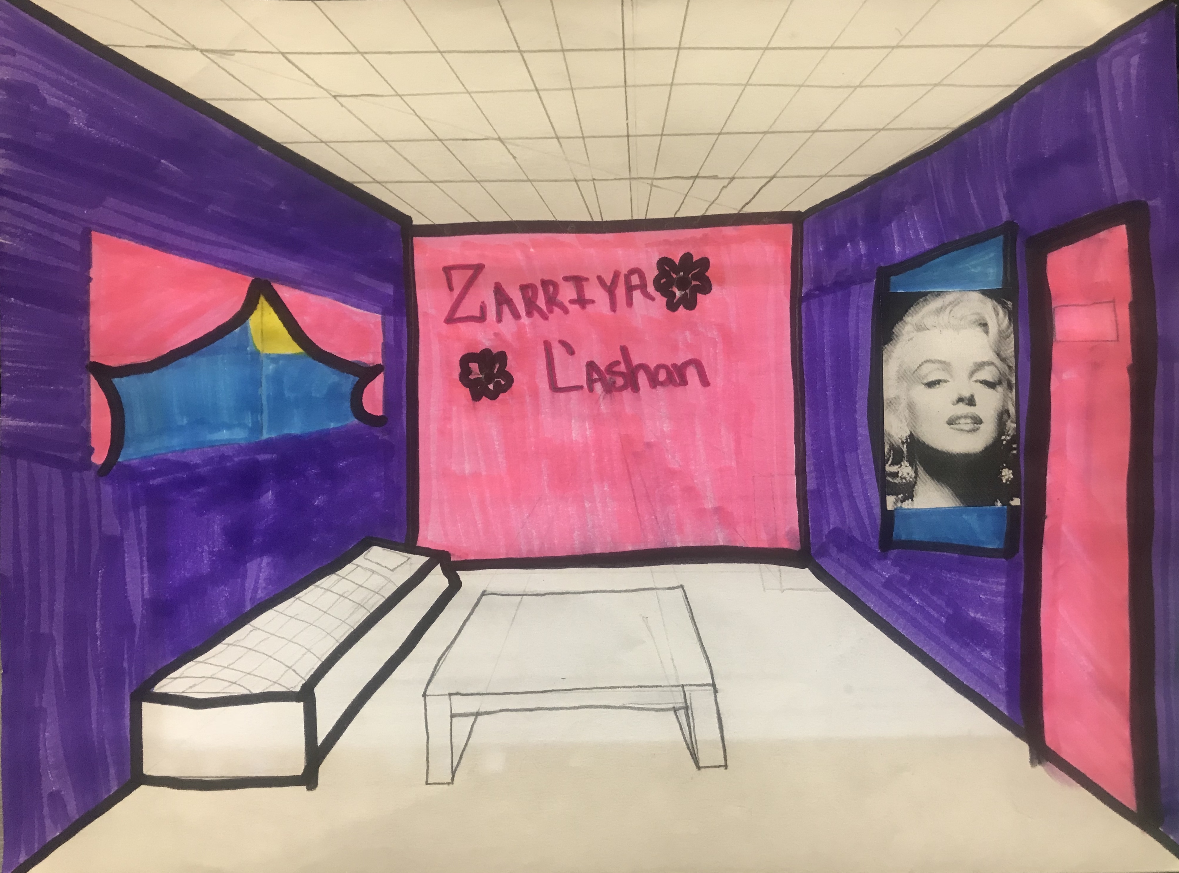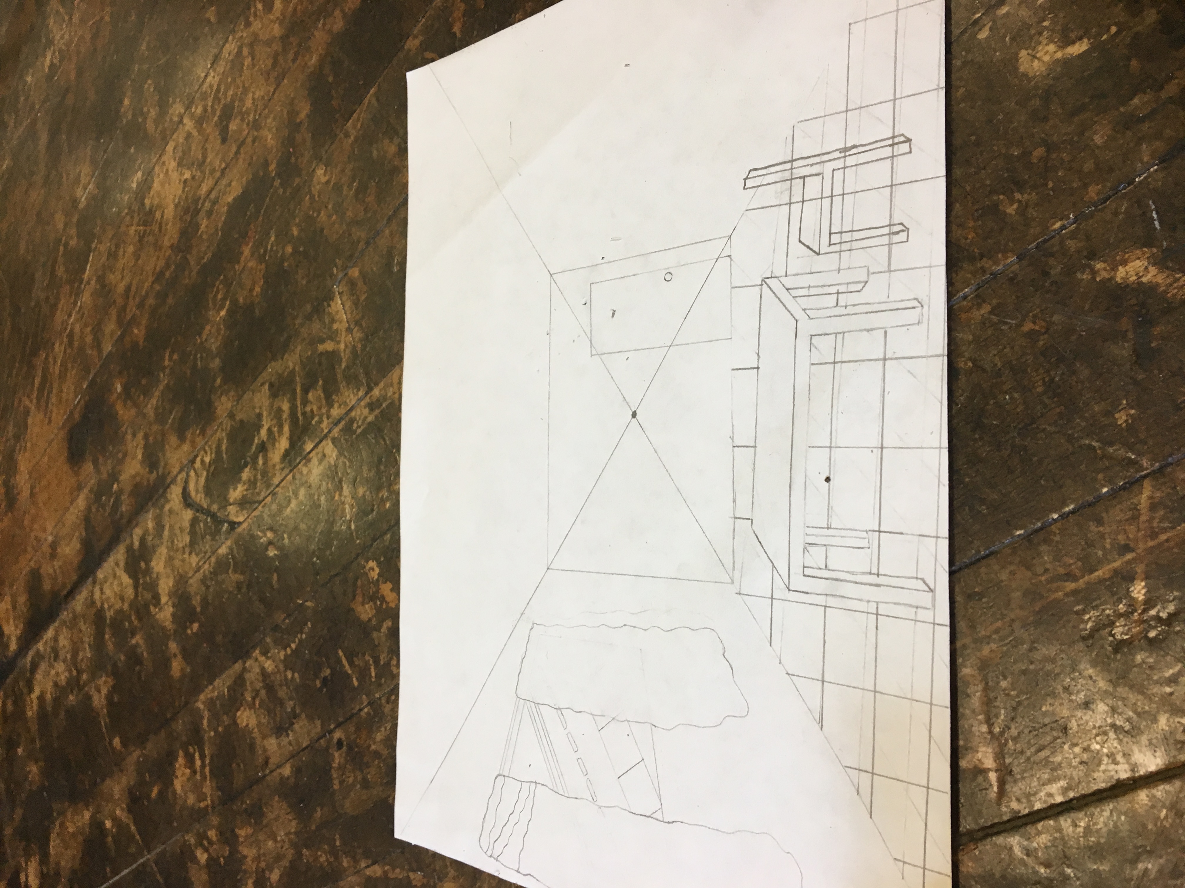 The room I drew is like the public space in a house It has a table, a tv, and storage. I learned a lot about one point perspective and how to create a drawing using one point perspective. I learned about the vanishing point and how to use it to create objects. The most thing I am proud of in my room is my floor it took some time to get it right. One thing I wish I could improve upon is the lack of some furniture. One tip for anyone is USE A RULER it is the most important tool in this project