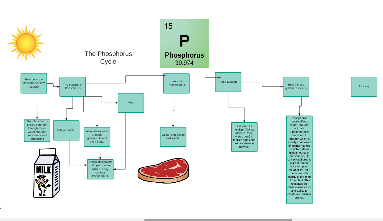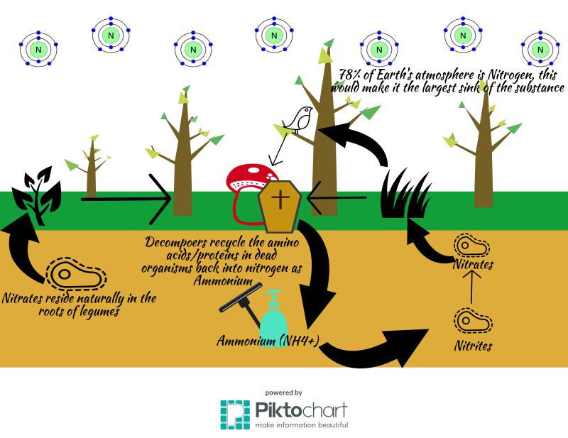 Beginning as nitrogen gas in the atmosphere, it is then trapped by bacteria and certain species of plant. The nitrogen in these organisms along with the nitrogen released by decomposers combine to form Ammonium. Ammonium is a component of soil that is absorbed by plants and nitrifying bacteria. Consumers intake the nitrogen in plants/other animals they consume and the bacteria’s nitrogen combines to create nitrites. Nitrites exposed to another oxygen become nitrates which eventually become nitrogen gas again. It is important because it is a component of amino acid and nucleic acid, no organism could live without these. It is converted from nitrates/nitrites to acids by our bodies.