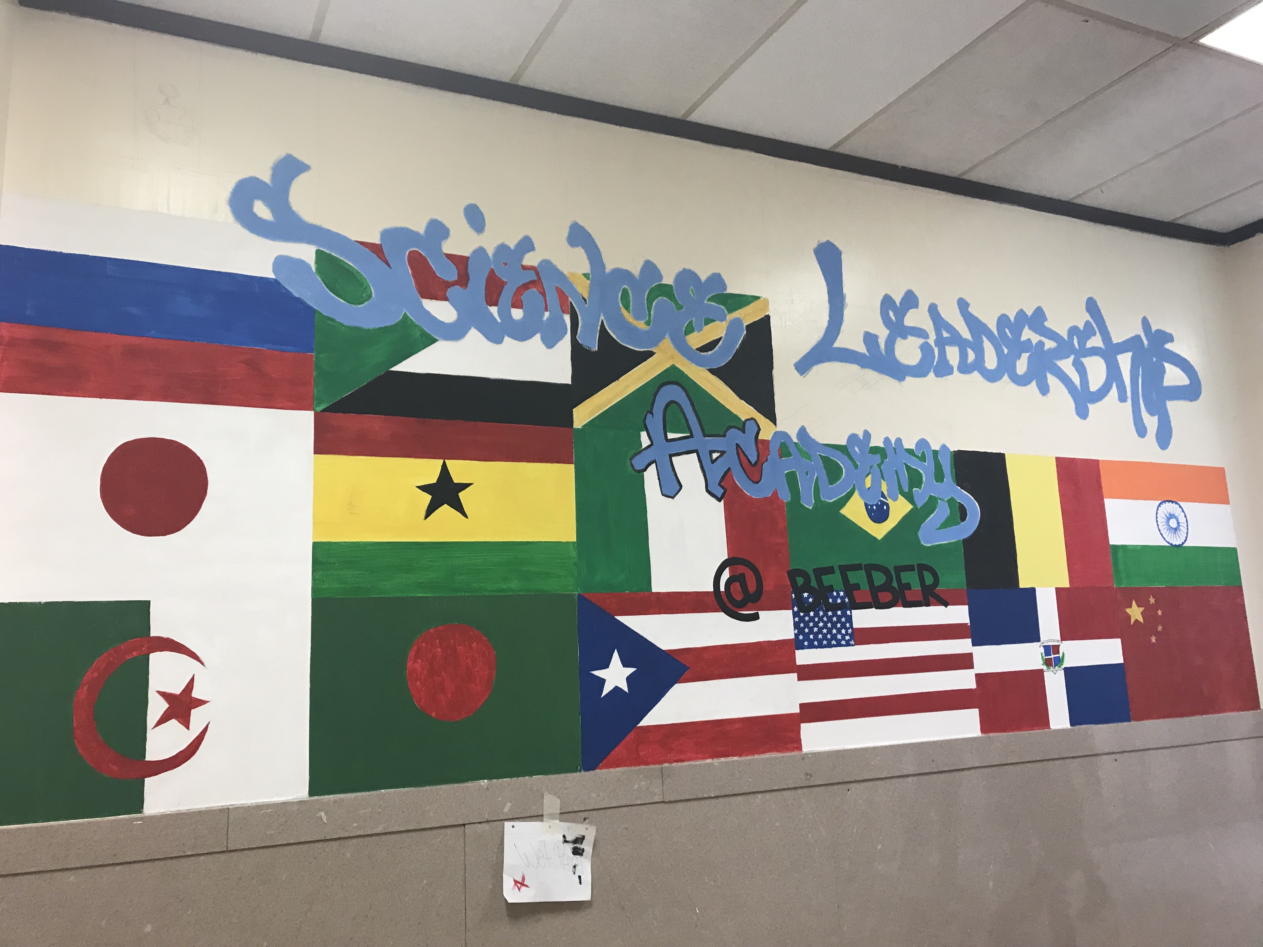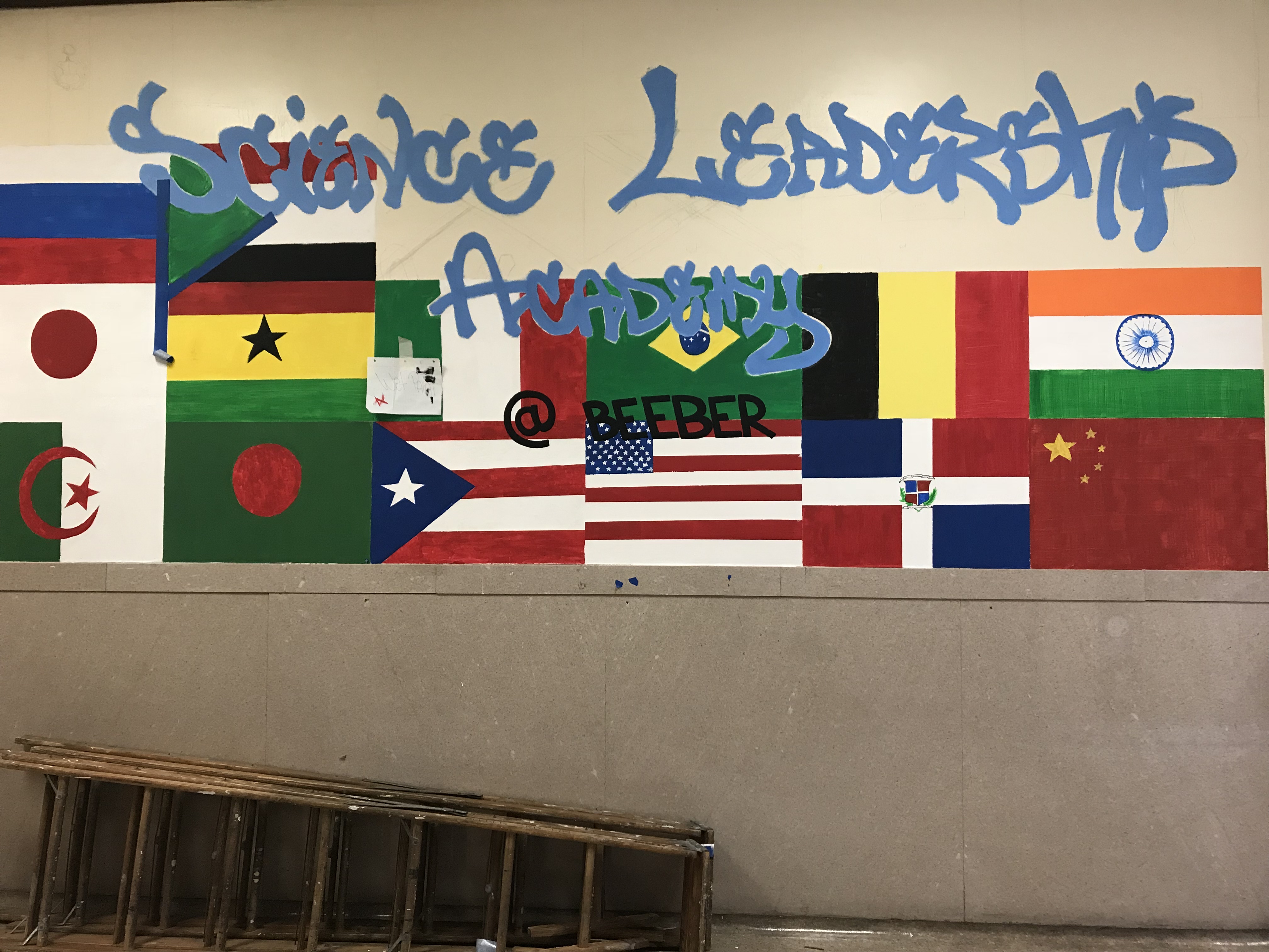 My final project for high school is a mural. This mural is very creative and lights up the hallway. My partner and I decided to work on a mural, we started with 5 mini walls we would do but then decided to do one wall that represents everything. The wall contains flags of the students that go to Science Leadership Academy @ Beeber and the name of the school. We wanted to include the students and their opinions, we started off with surveys for the students which asked for “What country are you from?”. From there we started sketching, my partner and I had different ideas first but we decided that we should combine everything together. While doing this mural, I have seen many students connect with the flags that we put up, they were excited for their flags to be on the wall. Cyrus and I put a lot of hard work on this project, we both went out of our way to get the supplies we need. This mural is my favorite high school project that I spent days and days working on.