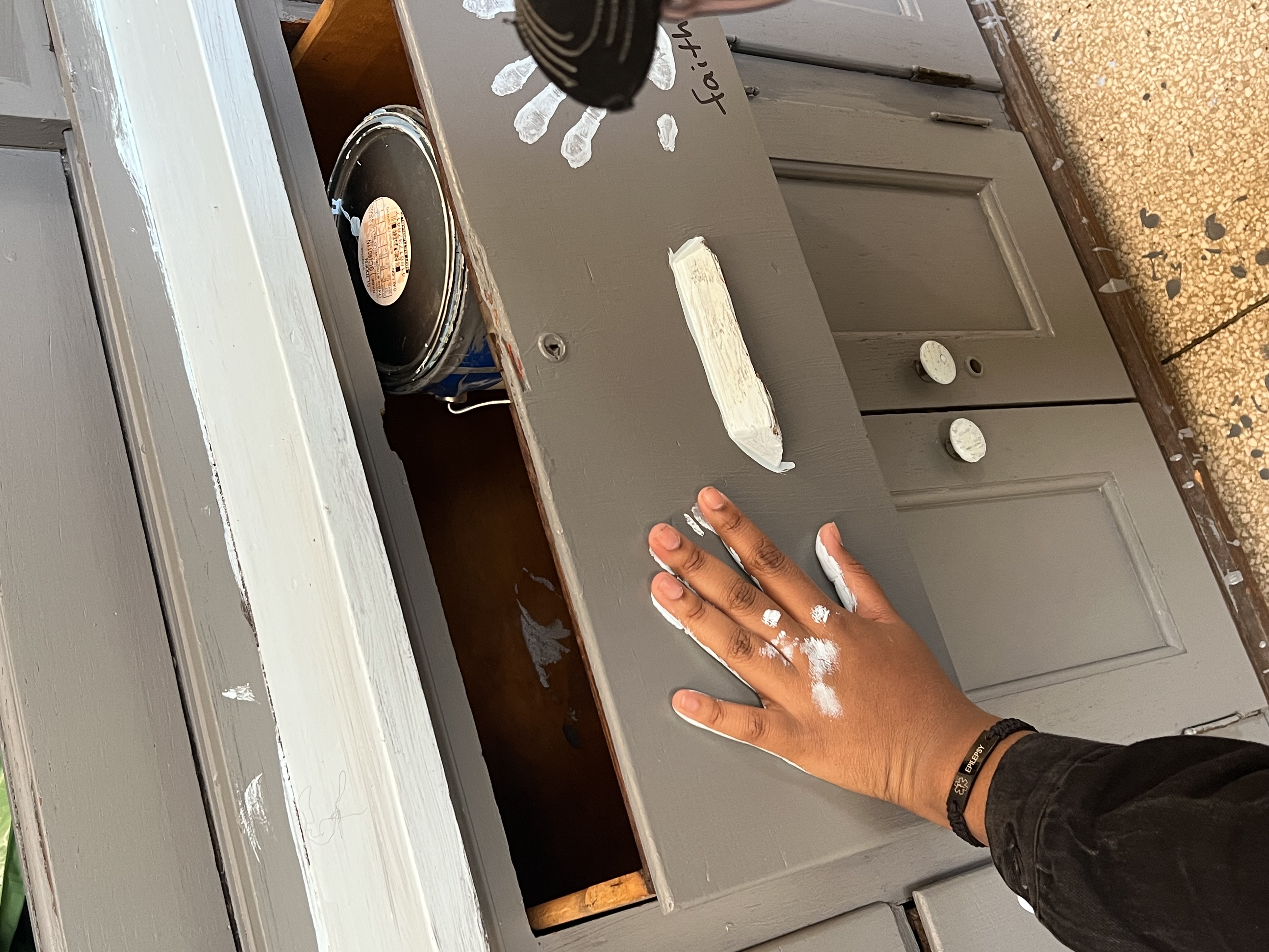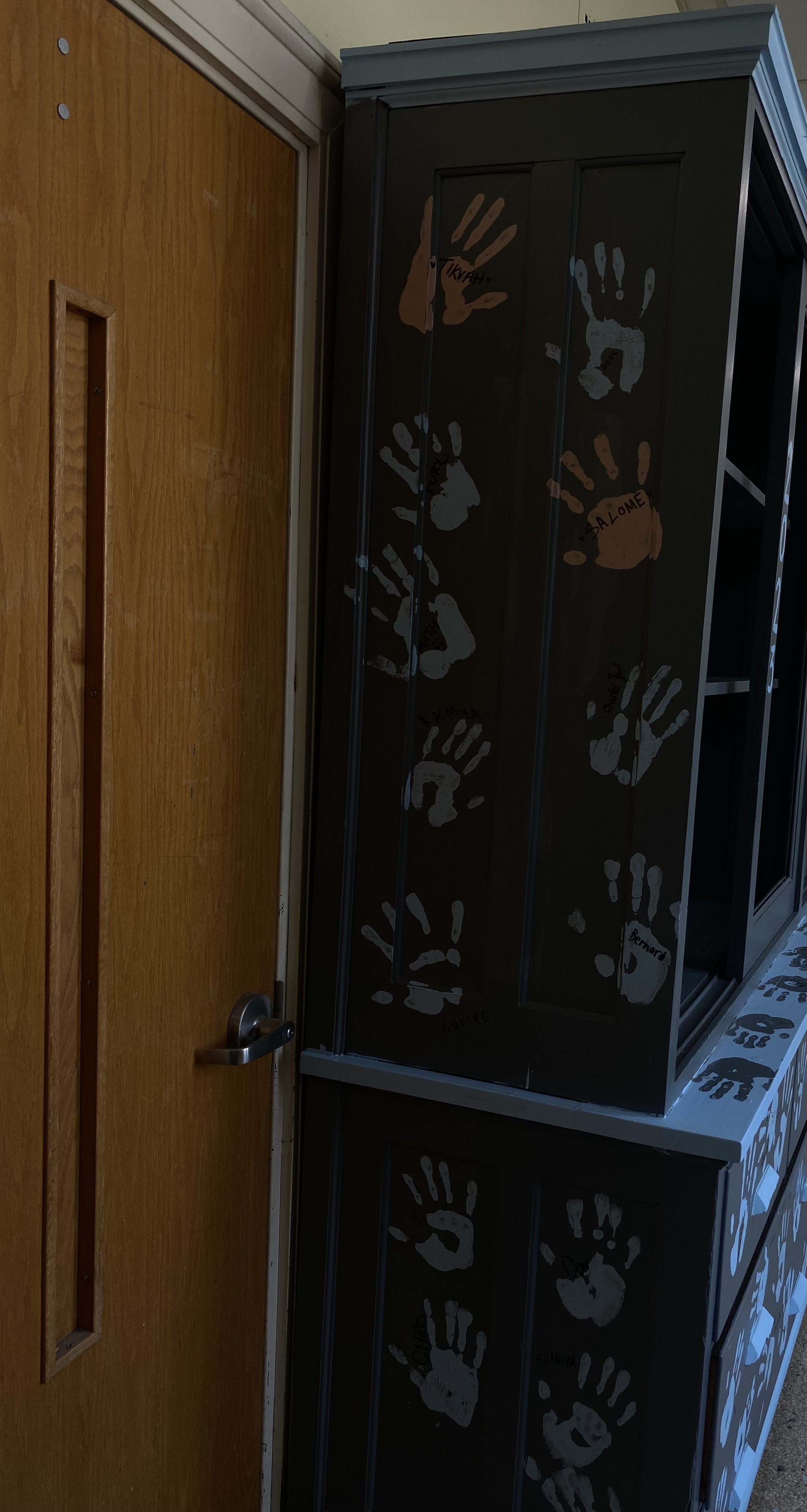 when looking at our school the school needed some color. Instead of the dull hallways that we always wonder about and always tell our peers we need color or something to spice it up. So what better to do than rebuild a bookshelf and leave something behind us? We wanted to give something to the students other than something that has to do with schoolwork. We wanted to give students new books so that when they want to escape the reality of school they can enter another one by getting a book. So we had to sand and paint the bookshelf and put the hands of the seniors on it so that they can leave something behind before they leave for good. then the last part was to put the books in and call it a day.