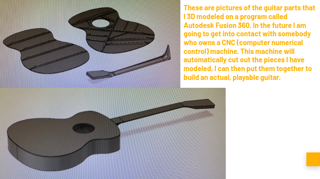 For my capstone, I decided to 3D model guitar parts (and possibly cut them out and put them together to form an actual playable guitar). From this experience, I gained a much deeper understanding of how to use the tools and the different options on Autodesk Fusion 360 (3D modeling program). Before I took on this project, I never knew half the amount of things that I do now. Doing this project also helped me gain the knowledge and experience that I needed to get certified in this program. This project impacts the school environment because it gives people inspiration on exactly what they can accomplish. Building a guitar is one of the most complicated tasks I have done in life, so if I can 3D model guitar parts, future students can 3D model things that they want as well. Although the guitar isn’t actually built, I am very proud of the effort that I put into it. I would spend hours upon hours each day learning how the program works and using that knowledge to model my guitar parts. However, I am very disappointed that I did not build the actual guitar. Because of this, if I were to take on this project again, I wouldn’t wait as long to cut the pieces out. I didn’t fully understand the process of cutting with the CNC Machine and I expected it to be a very quick process.
